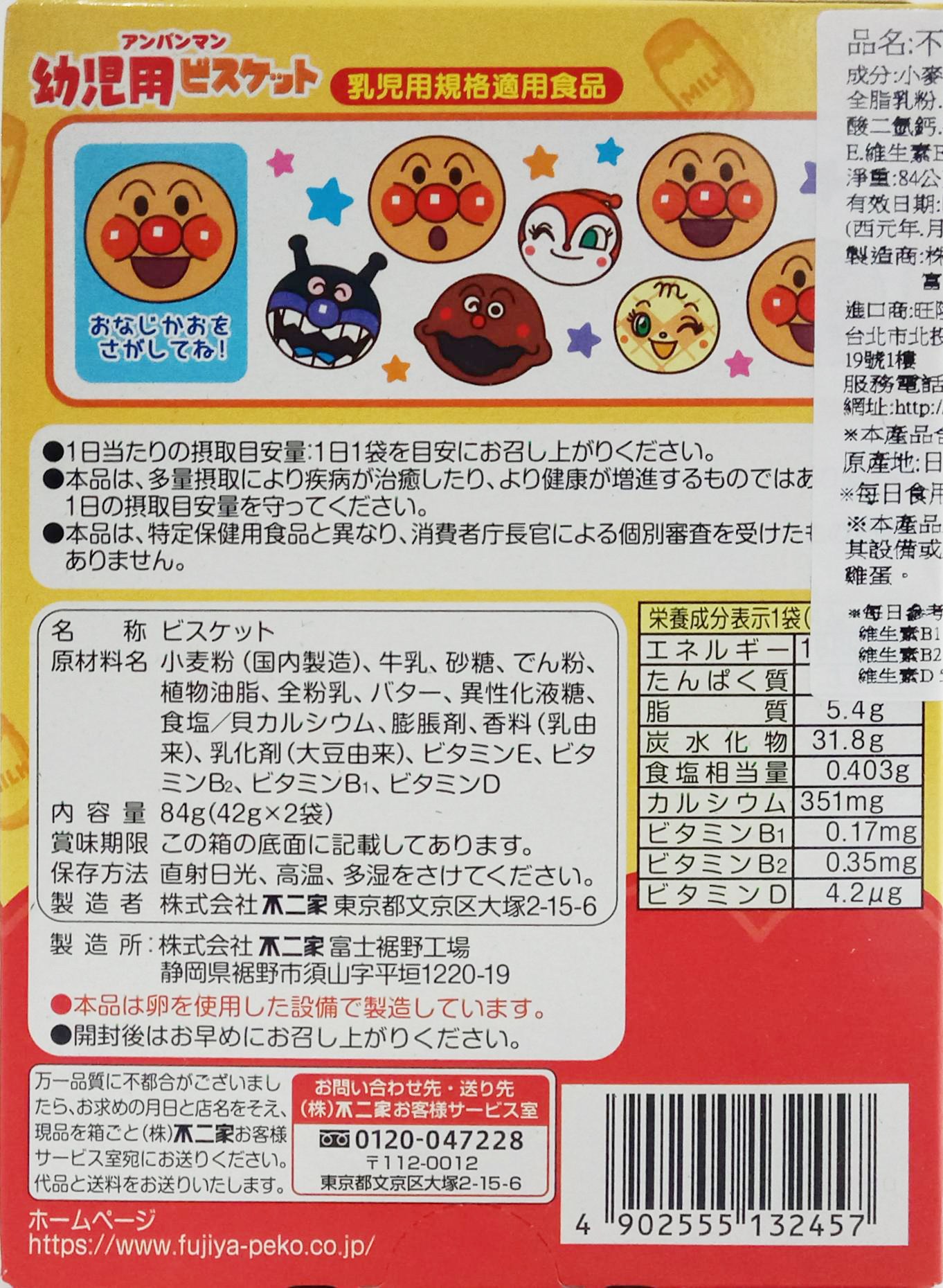 FUJIYA ","不二家麵包超人牛乳餅",是專為9個月以上寶寶設計的美味點心。這款餅乾使用日本國產小麥製成,不含雞蛋,口感溫和,容易消化,非常適合寶寶。每盒包含2包,共84克,方便攜帶和保存。餅乾中添加了鈣和維生素D,有助於寶寶的骨骼發育。可愛的麵包超人造型,讓寶寶愛不釋手,是媽媽們安心的選擇。