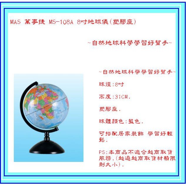 這款8吋藍色海洋行政地球儀,型號MS-108A,是理想的學習工具,也是精美的辦公室或家居裝飾品。塑膠材質輕巧耐用,方便攜帶和使用。清晰的政治地圖劃分,幫助孩子們輕鬆學習地理知識,認識世界各國的位置和邊界。無論是學生、教師還是地理愛好者,這款地球儀都能滿足您的需求,讓您在探索世界的同時,增添一份樂趣和知識。