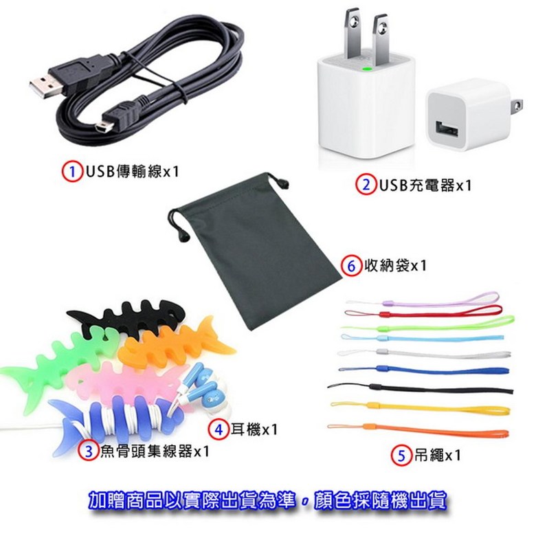 六大好禮: 充電器x1,USB傳輸線x1,耳機 x1,收納袋x1,魚骨頭集線器x1,吊繩x1