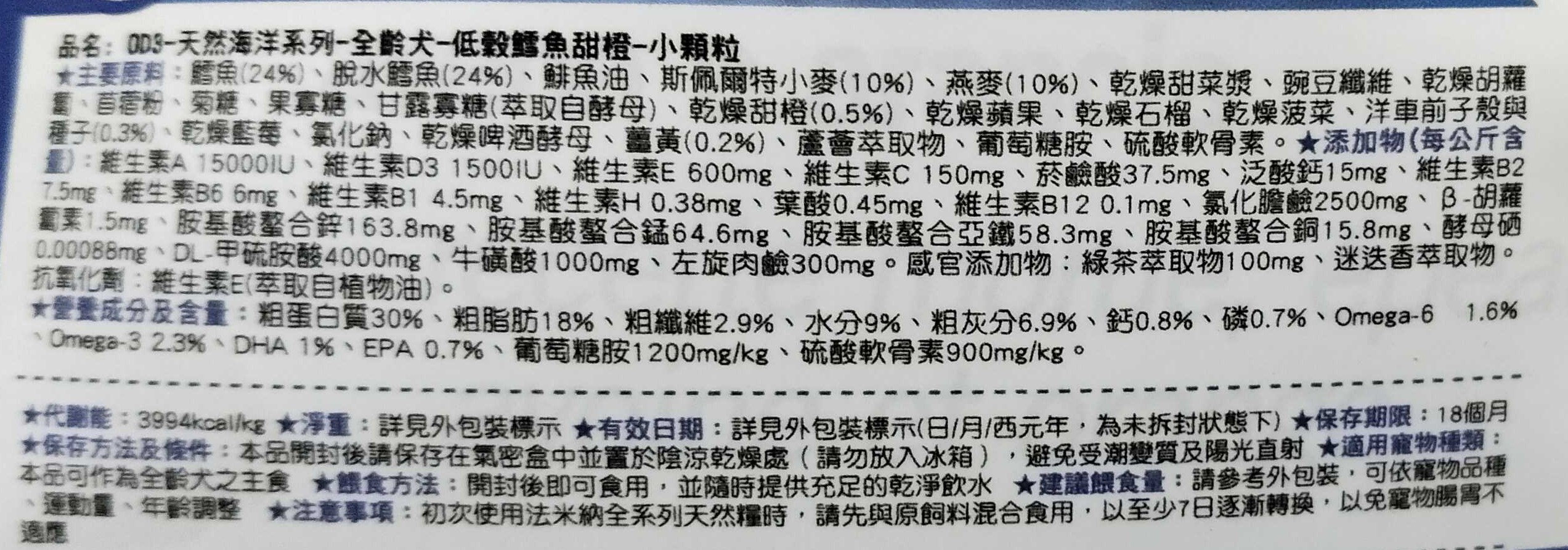 Farmina 法米納 OD3 天然海洋系列全齡犬小顆粒低穀糧,以鱈魚和甜橙為主要成分,提供您的愛犬均衡且美味的飲食。這款低穀配方特別適合對穀物敏感的狗狗,有助於維持消化系統健康。小顆粒設計方便小型犬咀嚼和吸收,確保牠們獲得足夠的營養。富含 Omega-3 脂肪酸,有益於皮膚和毛髮健康,讓您的愛犬由內而外散發健康光彩。2.5 公斤包裝方便儲存和使用,是您照顧愛犬的理想選擇。