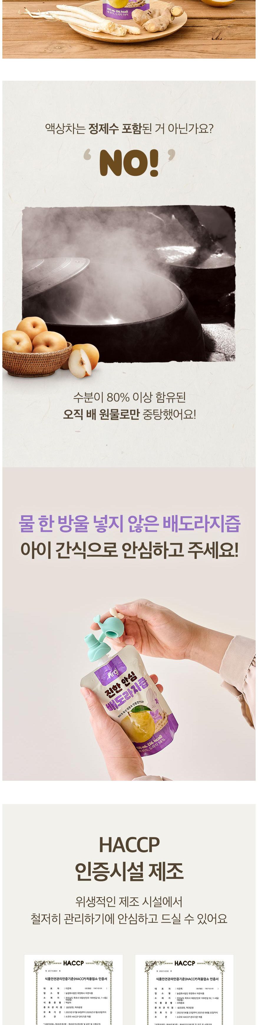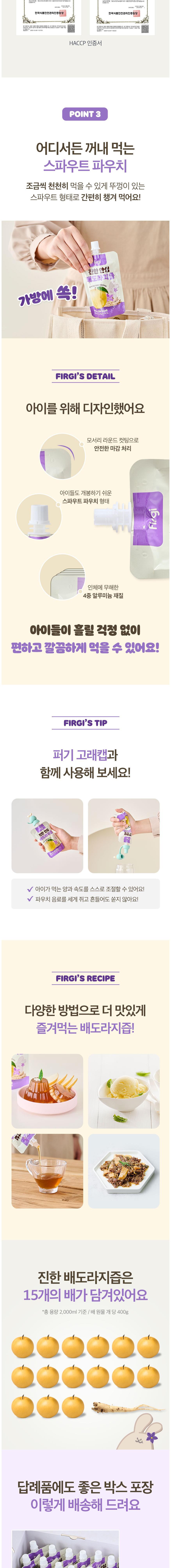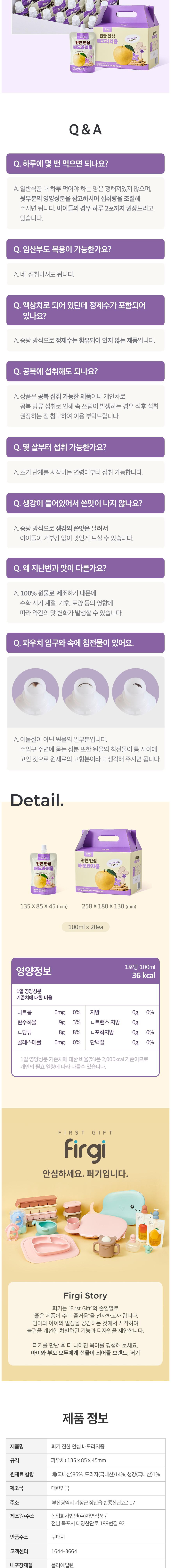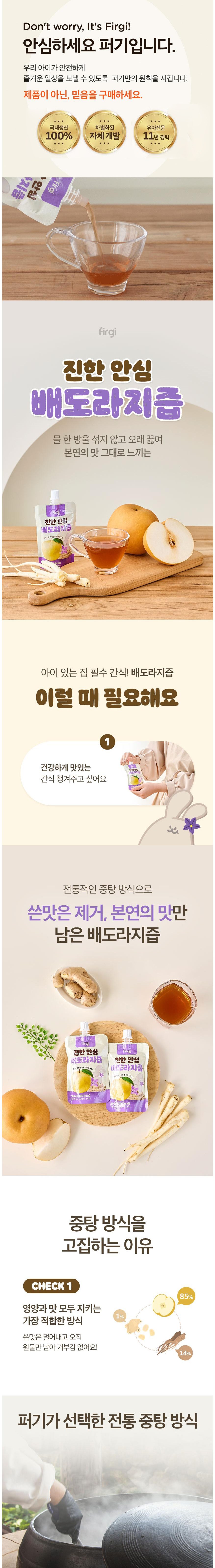 Firgi 香醇桔梗梨汁,嚴選韓國產梨與桔梗,以黃金比例調配而成,不添加一滴水,採用傳統隔水加熱工法,完整保留食材的原汁原味與營養價值。口感溫潤香甜,無苦澀味,讓寶寶輕鬆接受。獨立吸嘴包裝,方便攜帶與隨時飲用,是寶寶補充水分與營養的健康好選擇。通過HACCP認證,品質安全有保障,讓媽媽安心。