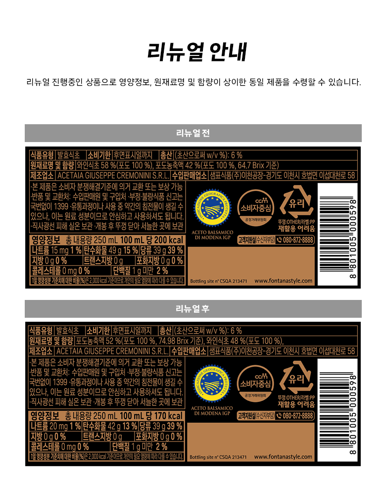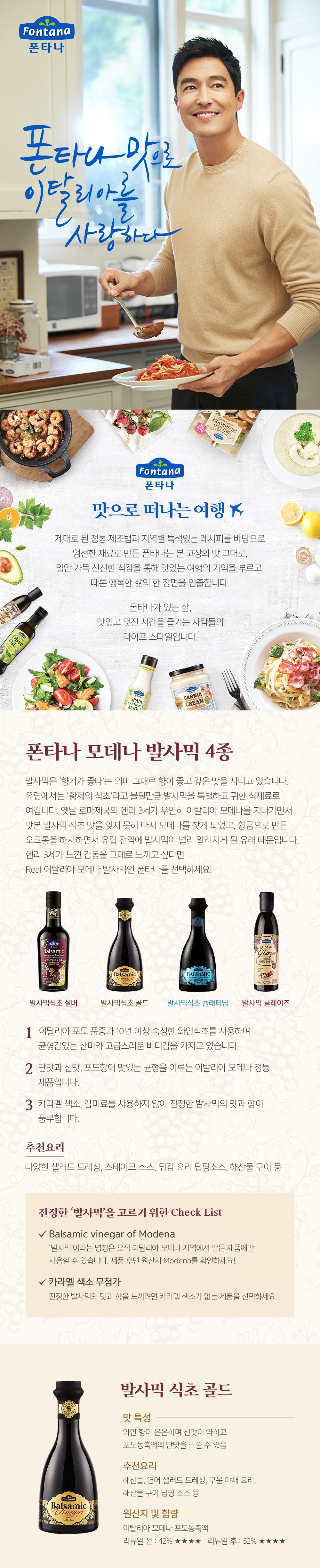 Fontana 폰타나,以義大利的美味帶您踏上味蕾之旅!Fontana 폰타나 秉持著對義大利美食的熱愛,嚴選食材,並以正統工法結合各地區的獨特食譜,打造出原汁原味的義大利風味。每一口都帶您回味旅行的美好記憶,更為您的生活增添幸福的滋味。讓 Fontana 폰타나 陪伴您,享受美味,品味美好時光!Fontana 摩德納香醋系列,共有三種風味。香醋,正如其名,擁有絕佳的香氣與濃郁的風味,在歐洲被譽為「帝王的調味品」,可見其珍貴與美味。這款香醋的歷史可以追溯到古羅馬時代,據說當時的亨利三世國王在途經義大利摩德納時,偶然品嚐到當地釀造的香醋,從此對其念念不忘。為了再次品嚐這令人難忘的美味,亨利三世國王再次造訪摩德納,並贈予當地一個以黃金打造的橡木桶,用於釀造香醋,也因此讓摩德納香醋的美名傳遍歐洲。如果您也想體驗亨利三世國王所感受到的美味感動,那就不能錯過 Fontana 摩德納香醋系列!Fontana 摩德納香醋系列,嚴選義大利摩德納當地的新鮮原料,並採用傳統工法釀造,經過長時間的熟成,完美融合了食材的精華,每一滴都蘊含著義大利傳統的風味。