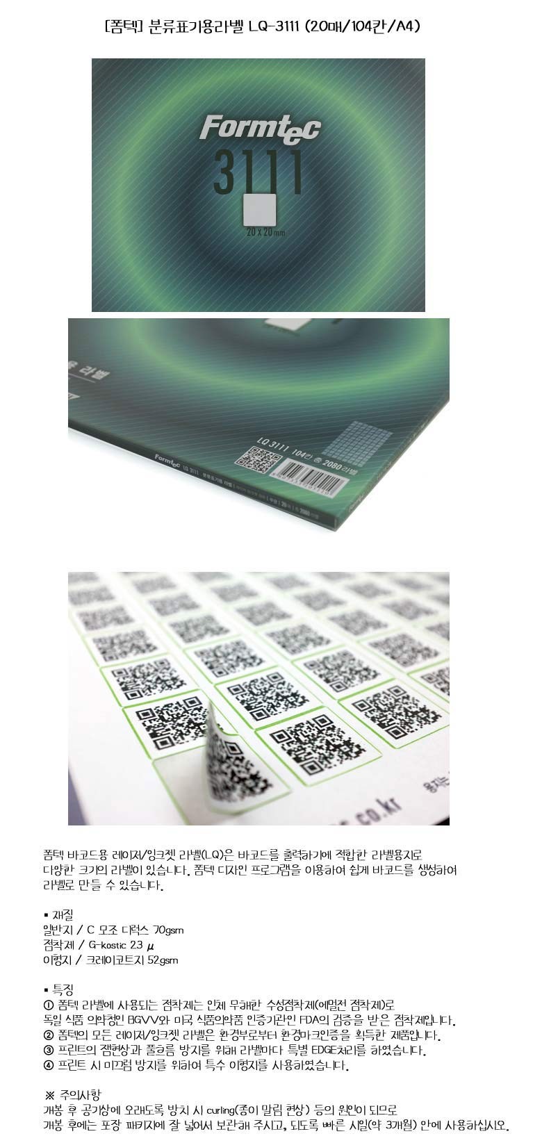Formtec 計算機分類標籤紙 LQ-3111,是您辦公室分類整理的好幫手。這款標籤紙適用於雷射和噴墨印表機,方便您在家或辦公室輕鬆列印。每張A4大小的標籤紙包含104格,尺寸為20 x 20 mm,一包共有20張,提供充足的標籤數量。採用環保水性黏著劑,安全無毒,讓您使用。無論是文件分類、產品標示,都能輕鬆完成,提升工作效率。