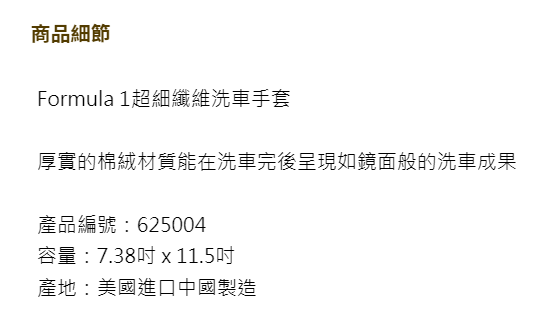 Formula 1 超細纖維洗車手套採用厚實的超細纖維材質,能有效吸附更多水分和清潔劑,讓您輕鬆去除車身上的污垢,呈現鏡面般的光亮效果。柔軟的材質能溫和清潔車漆,避免刮傷,讓您的愛車常保如新。此款洗車手套尺寸為 7.38 x 11.5 吋,方便握持和操作,讓您輕鬆完成洗車工作。無論是居家洗車還是專業美容,Formula 1 洗車手套都是您的理想選擇。產品編號 625004,品質保證,讓您安心使用。
