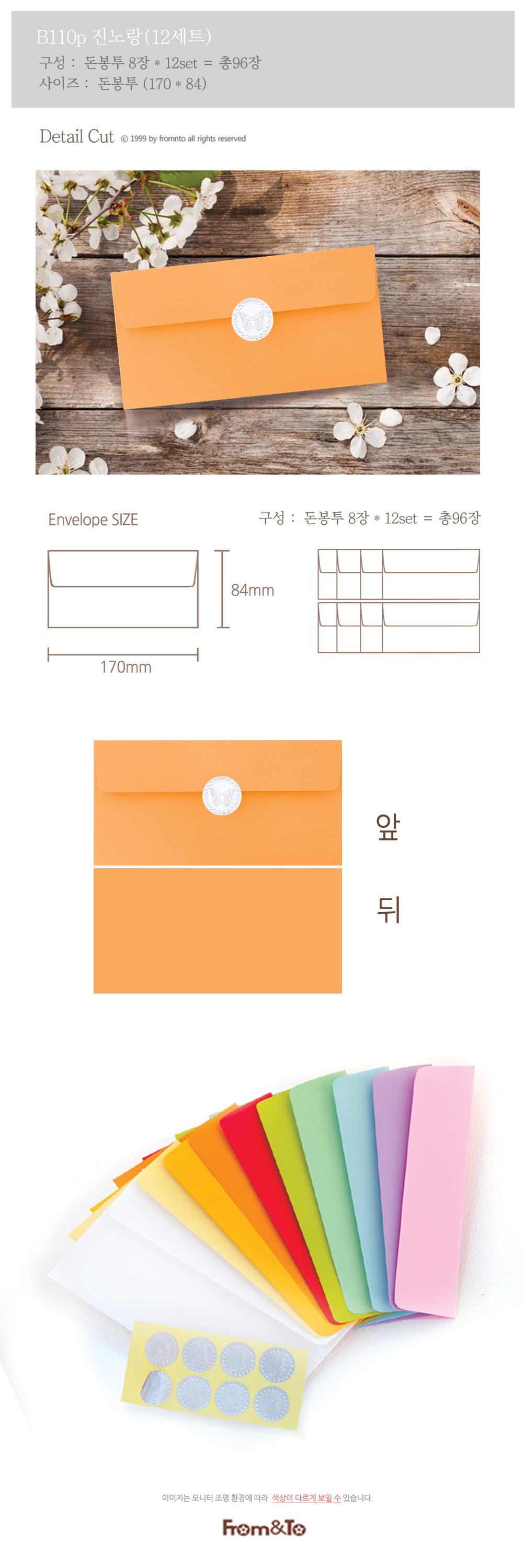 From&To鮮豔的彩色錢信封,為您的心意增添一份色彩。這款B110p深黃色錢信封套裝包含96張信封與96張貼紙,數量充足,經濟實惠。信封尺寸為170mm x 84mm,方便攜帶與存放。無論是節日祝福、生日贈禮,或是表達感謝,都能讓您的心意更加獨特。鮮豔的色彩,讓收到的人感受到您的用心與溫暖。