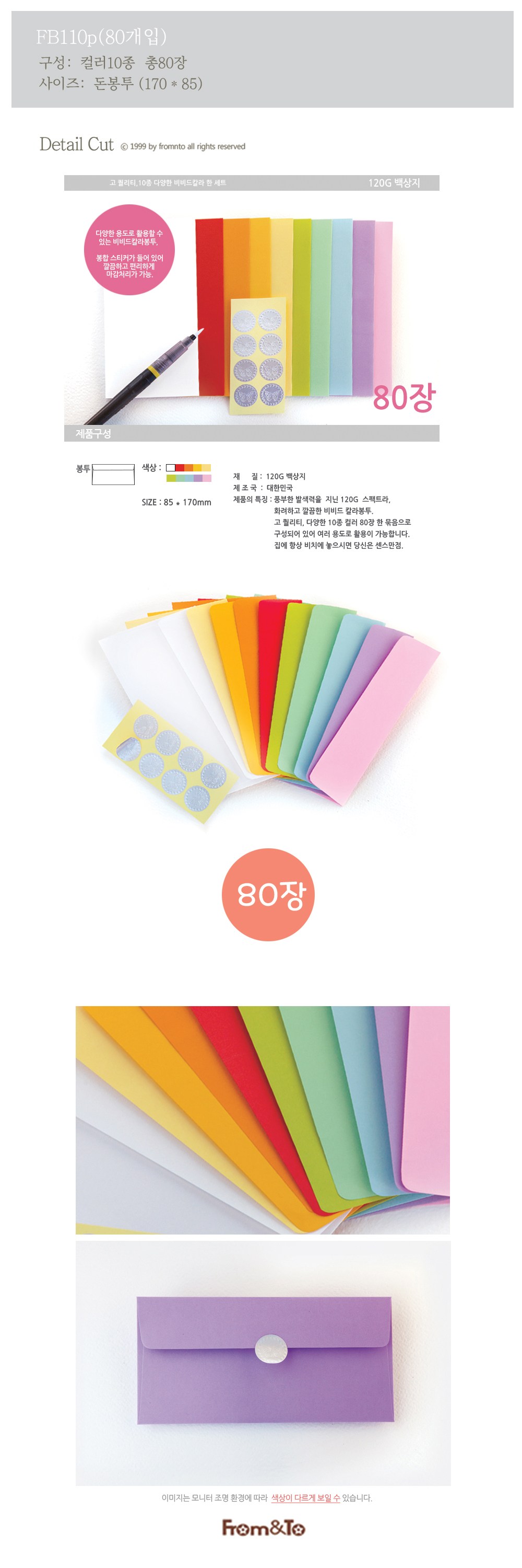 From&To鮮豔彩色信封組,包含80張信封與80張貼紙,隨機發貨,為您的生活增添色彩。信封採用120G銅版紙,色彩鮮豔飽和,質感細膩。每組包含10種不同顏色,可用於多種用途,如信件、禮物包裝等。內附封口貼紙,方便您乾淨俐落地完成封口。無論是寄送祝福或傳遞心意,這款信封組都能讓您的心意更加完美。