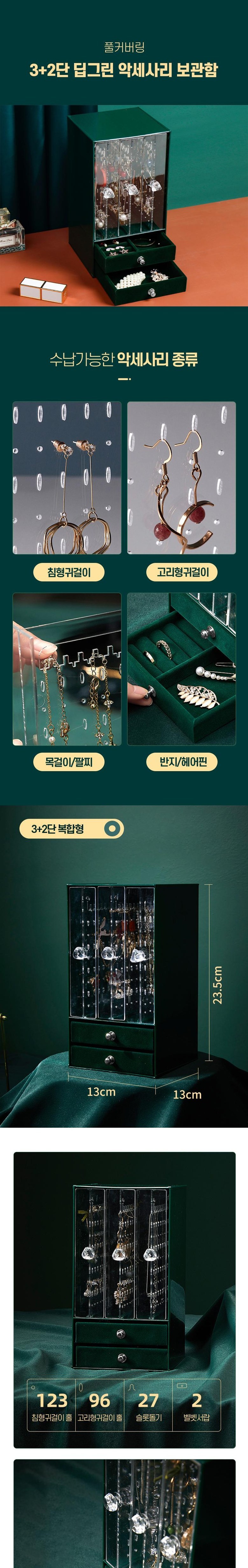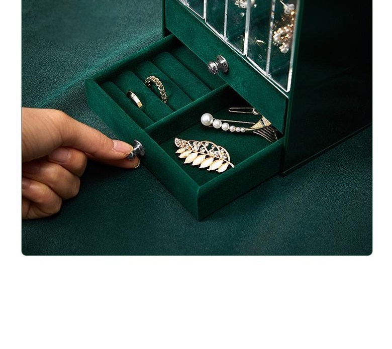 這款深綠色全覆蓋3+2層珠寶飾品盒,是您收納各式珍貴飾品的理想選擇。複合型設計提供多層空間,可輕鬆整理針式耳環、鉤式耳環、項鍊、手鍊、戒指和髮夾等。全覆蓋設計能有效保護飾品免受灰塵和刮傷,保持飾品的光澤。23.5cm x 13cm的尺寸,既能提供充足的收納空間,又不會佔用過多桌面空間。天鵝絨抽屜提供更佳的保護,讓您的飾品得到妥善的呵護。