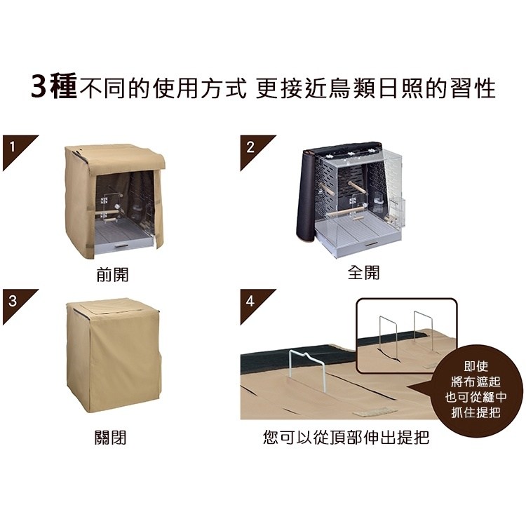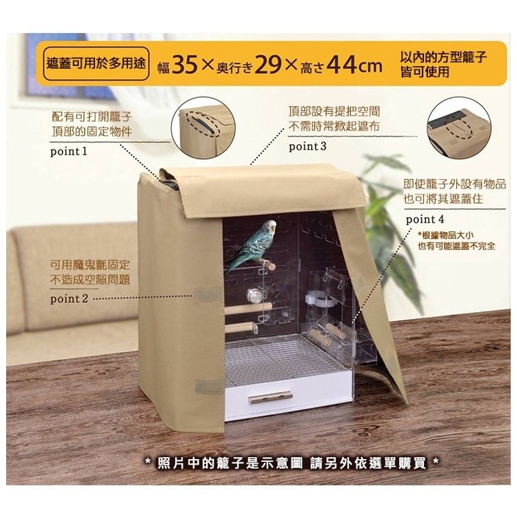 - 罩布能有效阻擋光線,營造安靜的睡眠環境,讓鳥兒得到充分休息,恢復活力,保持最佳狀態。
