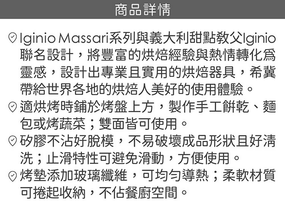 - 耐熱矽膠墊適用於烤箱,烘焙餅乾或麵包時受熱均勻更美味。