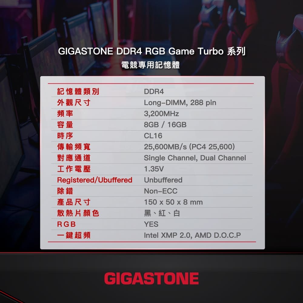 GIGASTONE 立達 GAME TURBO DDR4 3200 RGB 電競超頻 桌上型記憶體 PC專用 16GB 黑色, 2個, D4-3200-16U-2-TURBO