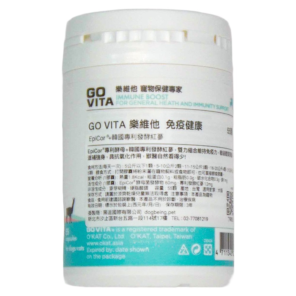 GO VITA樂維他免疫健康膠囊。本產品結合了EpiCor®專利酵母與韓國專利發酵紅蔘,雙效合一,能有效提升寵物的免疫機能,讓牠們自然健康。每罐含有55顆膠囊,方便餵食,只需將膠囊打開,將粉末混入寵物飼料或食物中即可。本產品適用於各種體型的犬貓,每日食用能幫助牠們維持最佳健康狀態。給您的愛寵最好的呵護,就從GO VITA樂維他開始!