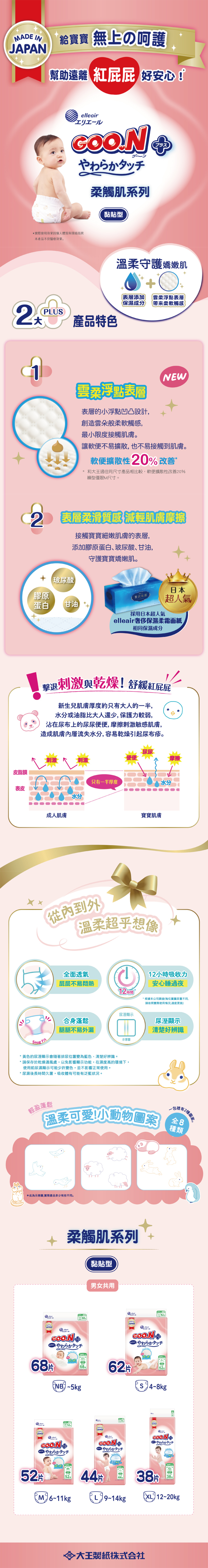 GOO.N大王日本境內版SJ柔觸肌系列黏貼型尿布,為寶寶提供頂級呵護。雲柔浮點表層,減少摩擦,呵護寶寶嬌嫩肌膚。添加保濕成分。全面透氣設計,保持乾爽舒適。12小時吸收,安心睡眠。合身剪裁。尿濕顯示,方便媽媽及時更換,給寶寶帶來舒適乾爽的體驗。