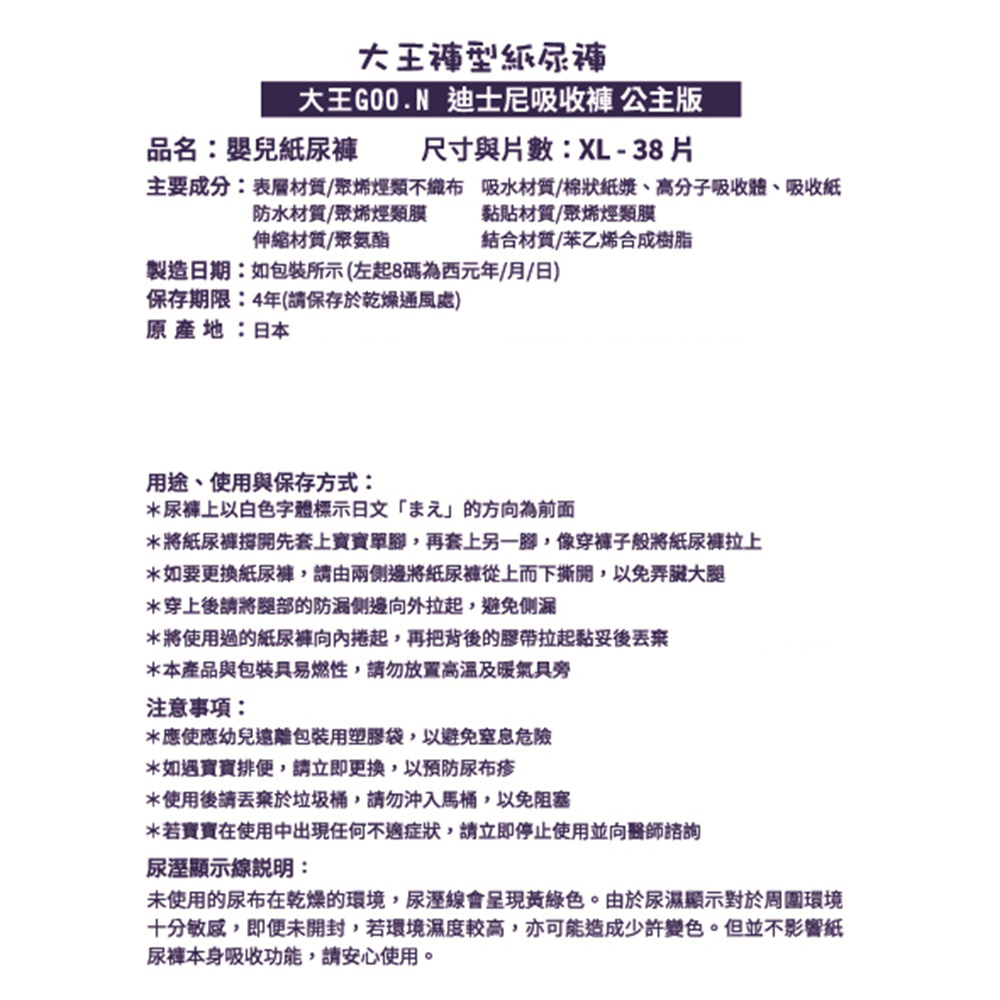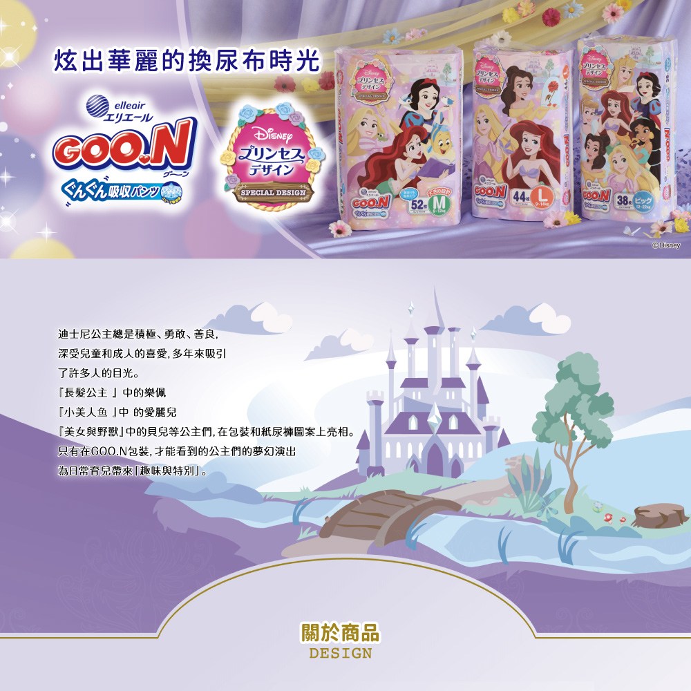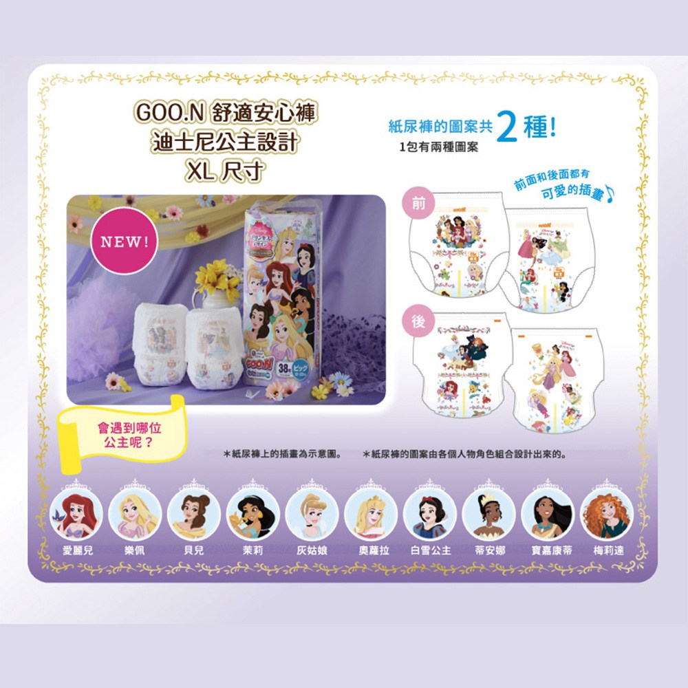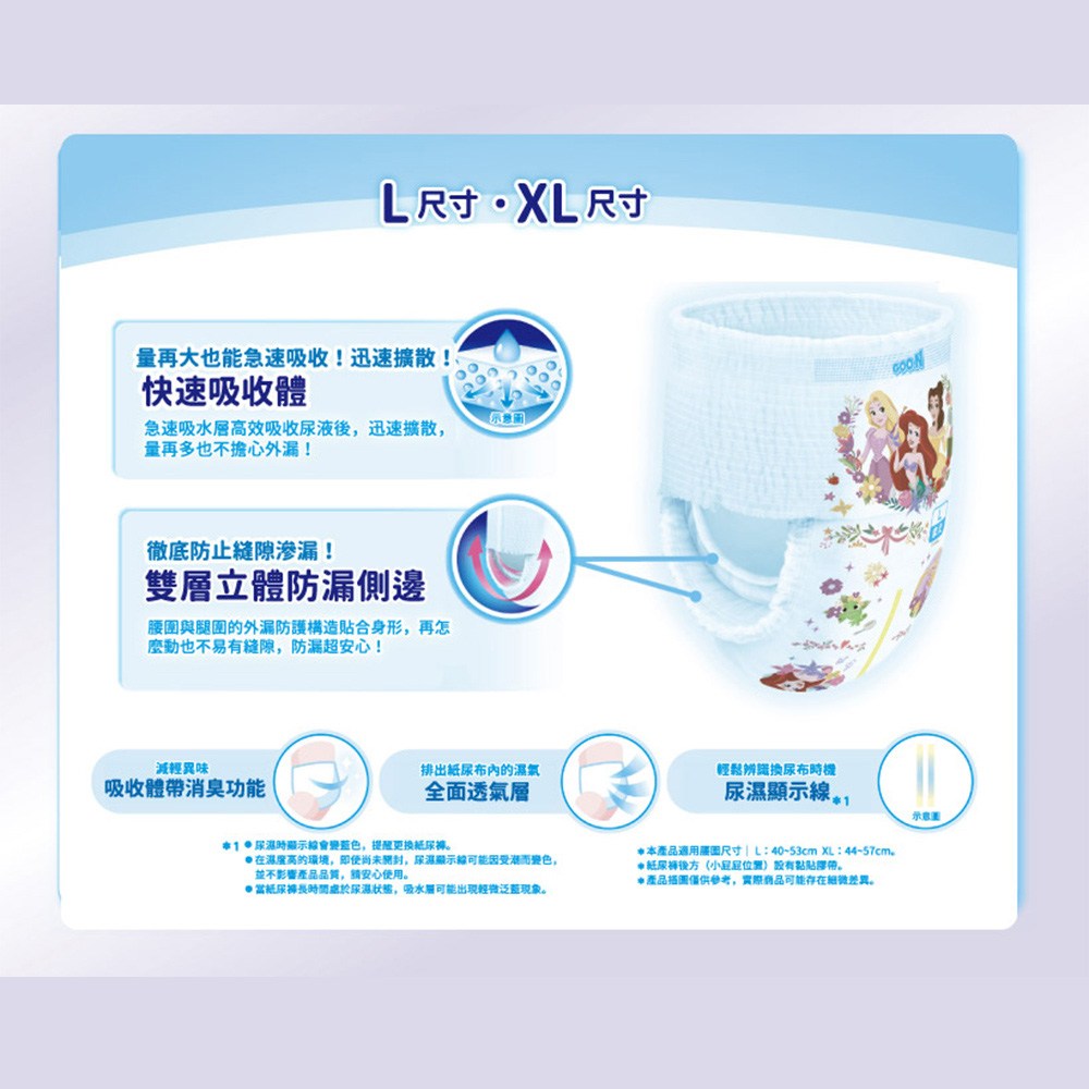 - 大王迪士尼公主褲型紙尿布,採用快速吸收層,能迅速擴散尿液,讓寶寶屁屁乾爽舒適