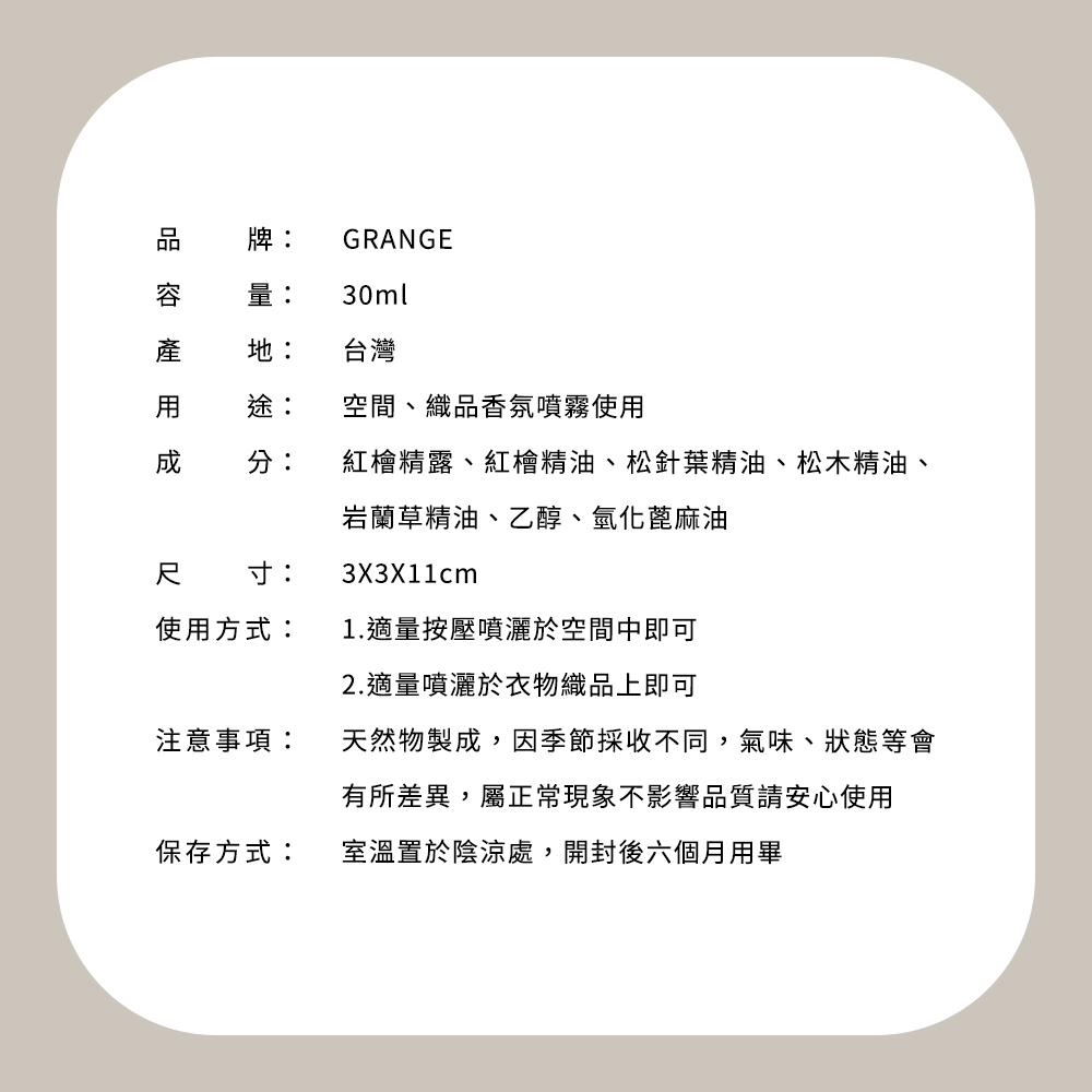 GRANGE 璞草園 遊山氣味噴霧,將山林間的清新氣息帶入您的生活。這款30ml的噴霧,散發著沉穩而帶有層次的木質香調,彷彿置身於山林之中,感受大自然的寧靜與療癒。不僅能清新空氣,還能噴灑於衣物或織品上,讓您隨時隨地享受遊山般的舒適氛圍。台灣製造,品質安心可靠,為您的居家生活增添一抹自然的氣息。