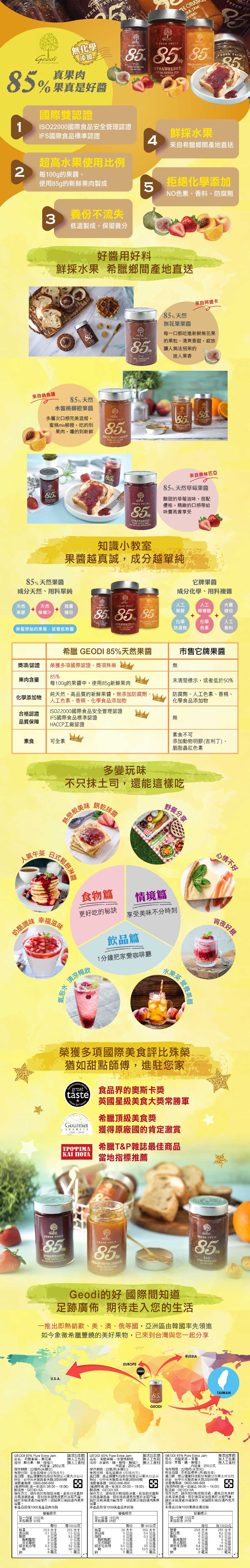 品嚐GEODI 85%天然草莓果醬,感受來自奧林匹亞的陽光滋味。這款果醬選用新鮮草莓,以高達85%的果肉比例製成,每一口都充滿濃郁的草莓香氣。製作過程堅持無化學添加,讓您安心享用。無論是搭配吐司、鬆餅,或是製作甜點,GEODI草莓果醬都能為您的味蕾帶來精緻的享受。通過ISO22000和IFS國際食品安全認證,品質值得信賴。