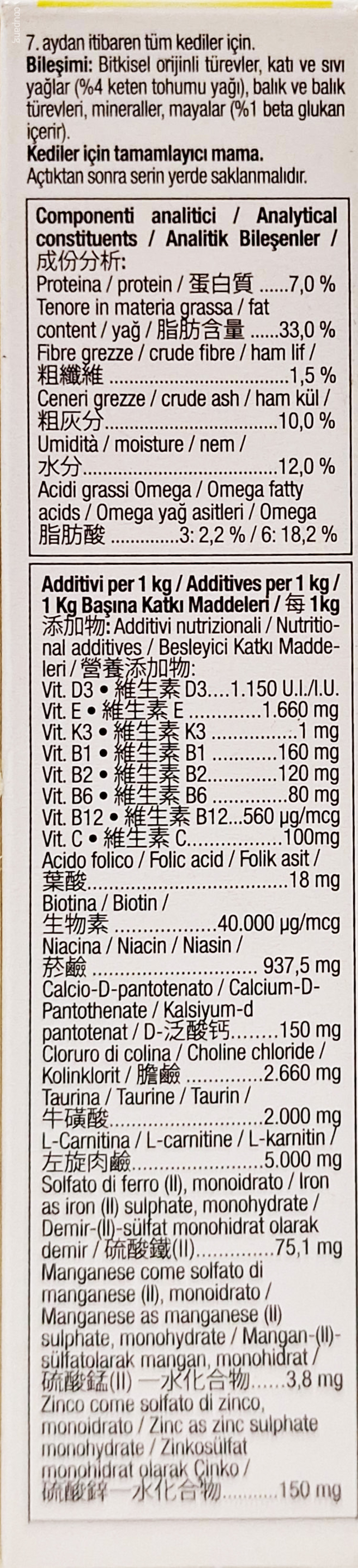 - - 內含Omega-3和Omega-6,滋養皮膚和毛髮,讓貓咪擁有柔亮光澤的毛髮。