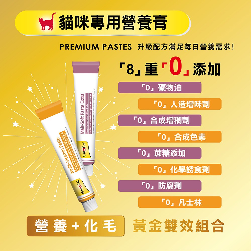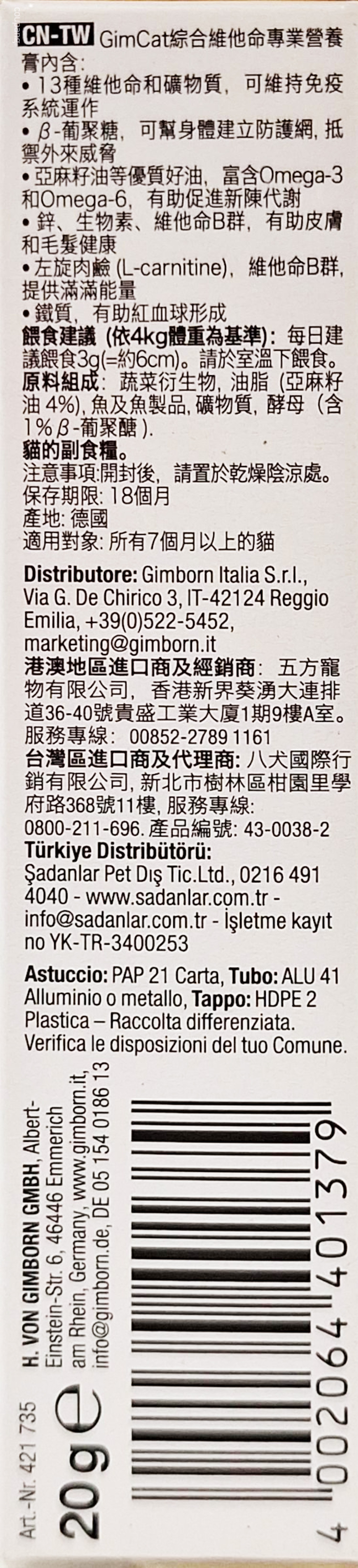 Gim Cat 俊寶綜合維他命專業營養膏,是專為7個月以上的貓咪設計的營養補充品。這款20g的營養膏富含13種維他命和礦物質,有助於維持貓咪的免疫系統健康運作,並提供每日所需的能量,亞麻籽油等優質好油則富含Omega-3和Omega-6,讓毛髮更健康亮麗。此外,左旋肉鹼(L-carnitine)和維他命B群能提供滿滿活力,鐵質則有助於紅血球形成。無添加糖,讓您的愛貓在享受美味的同時,也能維持健康。