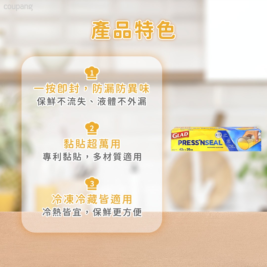 Glad Press’n Seal 強力保鮮膜是您廚房保鮮的最佳選擇。其獨特的一按即合技術,能輕鬆密封各式碗盤,確保食物新鮮不外漏。適用於多種材質表面,無論是玻璃、塑膠還是金屬,都能達到極佳的密封效果。不僅如此,它還能冷藏、冷凍,甚至微波加熱,滿足您不同的保鮮需求。易撕設計讓您方便取用,不再浪費,輕鬆切割所需長度,是現代家庭不可或缺的保鮮好幫手。