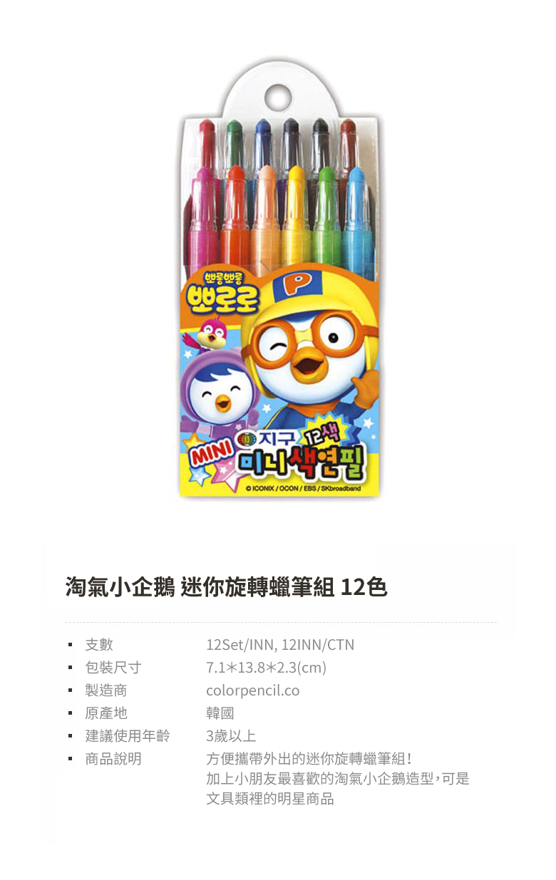 這款Globe Chemical迷你彩色蠟筆套裝,內含12種色彩豐富的蠟筆,讓孩子們的繪畫世界更加繽紛多彩。迷你旋轉設計,方便攜帶和使用,無需削筆,讓孩子們隨時隨地都能盡情創作。淘氣小企鵝造型可愛,深受孩子們的喜愛,是文具類裡的明星商品。韓國製造,讓家長們安心選購。適合3歲以上的兒童使用,激發他們的創造力和想像力。