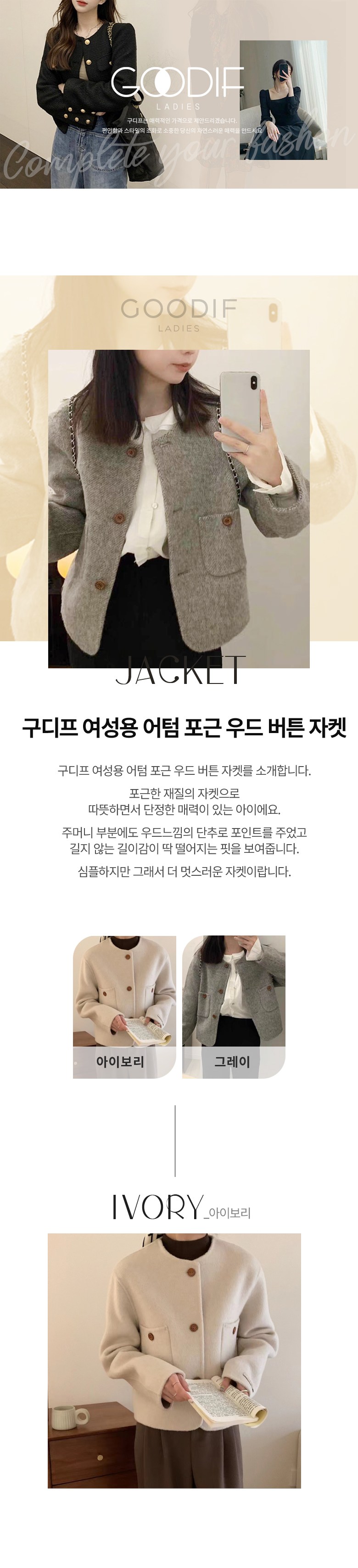 Goodif 女士秋季溫暖木質鈕扣夾克,以溫暖材質打造,兼具保暖與整潔感,散發迷人魅力。口袋部分以木質鈕扣點綴,增添設計感。俐落的短版剪裁,展現時尚風格。簡約設計更顯百搭,是秋季穿搭的理想選擇。這款夾克提供象牙白和灰色兩種選擇,為您的秋季衣櫥增添一抹亮色。