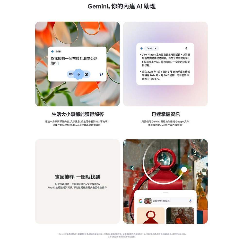 - 內建AI助理Gemini,隨時提供生活資訊,讓生活更加便利。