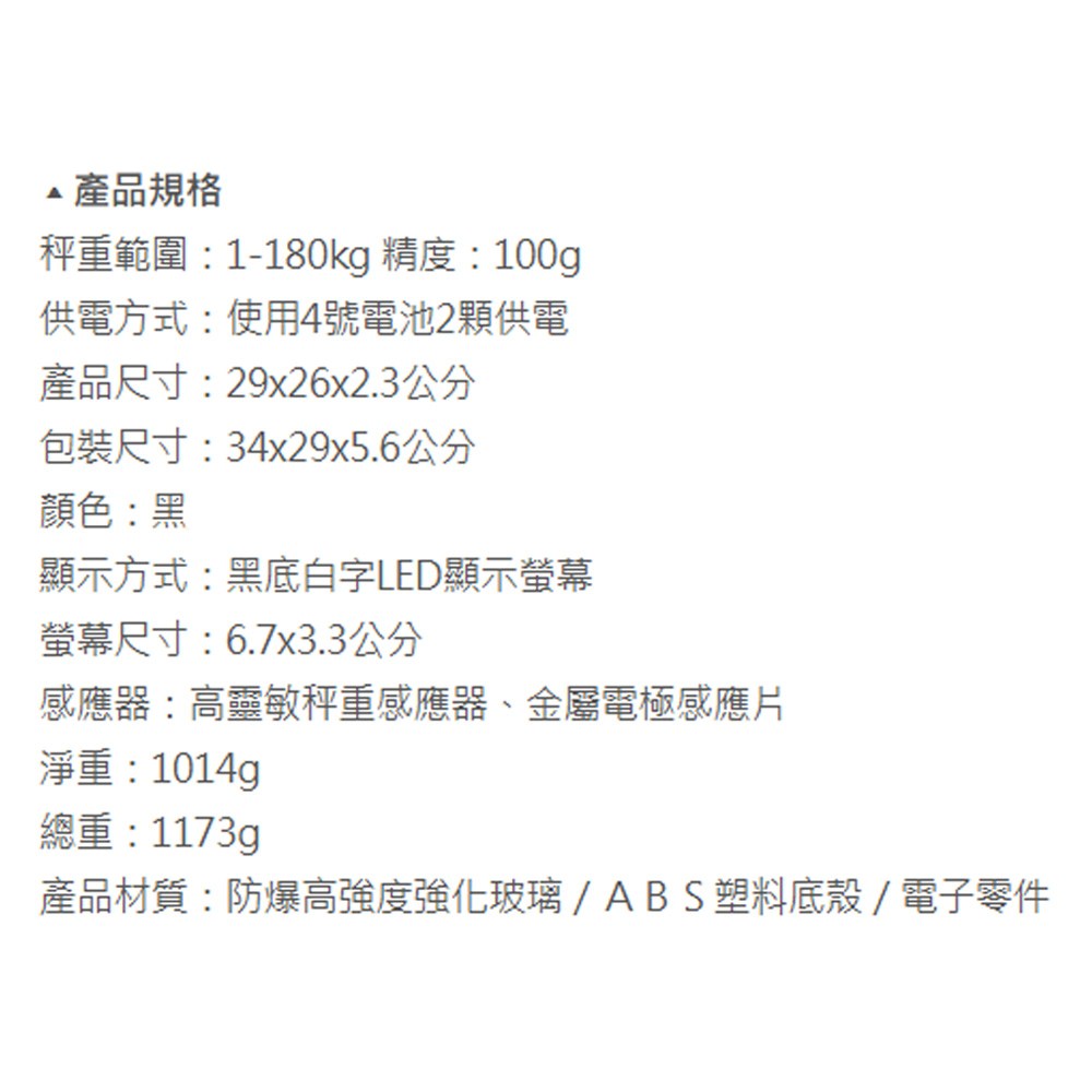 - 高精度感應器提供準確的測量結果,幫助您追蹤體重變化。