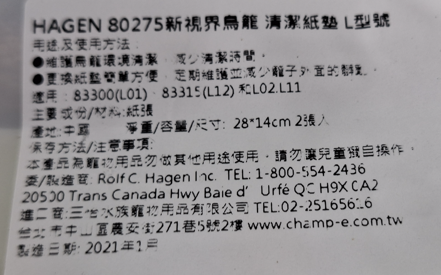 HAGEN vision 新視界 鳥籠清潔紙墊 L型號 28*14cm 2張入, 1包