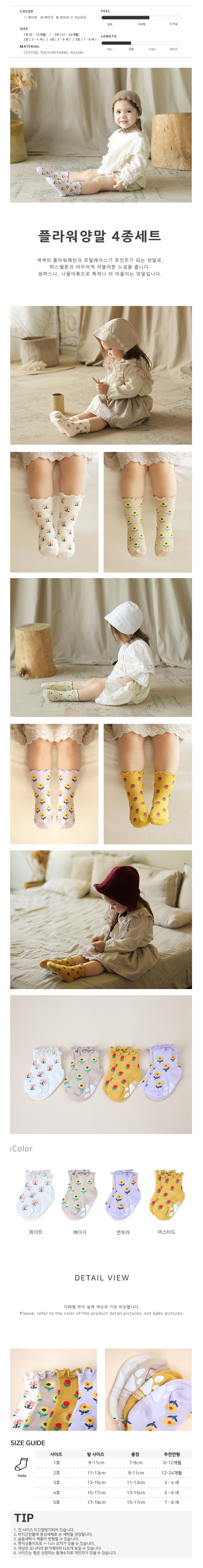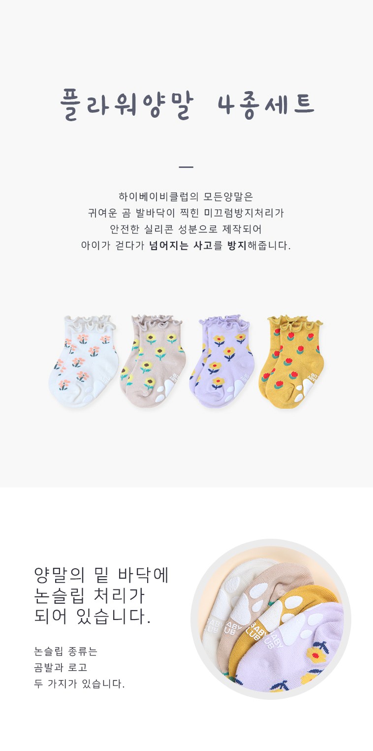 HI BABY CLUB孩童花朵款襪子四雙組,採用柔軟舒適的材質製成,呵護寶貝的嬌嫩肌膚。此款襪子設計亮點在於鮮豔的花朵圖案與可愛的荷葉邊,搭配柔和的配色,更顯活潑俏皮。四種顏色一次擁有,包含白色、米色、淺紫色與芥末黃,方便每日穿搭。襪子底部具有防滑設計,讓孩子們在室內也能安心玩耍。建議使用中性洗滌劑手洗,以延長襪子的使用壽命。
