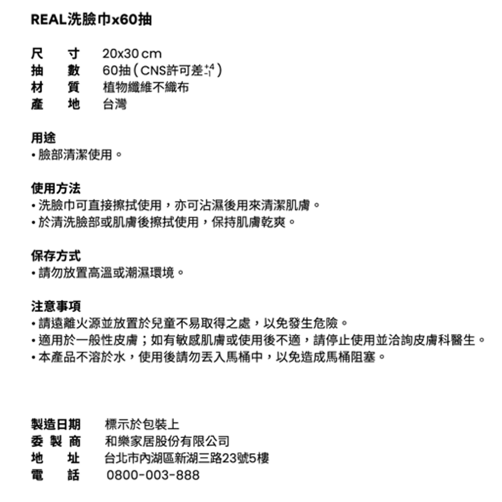 HOLA 和樂家居 REAL洗臉巾,採用100%植物纖維不織布製成,觸感柔軟親膚,給您溫和的清潔體驗。加大尺寸設計,輕鬆擦拭全臉,雙面紋理設計,凹凸面深層清潔,平滑面濕敷保養。乾濕兩用,吸水性極佳,不易起棉絮,不含防腐劑、螢光劑、無香精,讓您使用。台灣製造,是您居家清潔、外出旅行的理想選擇。使用後請勿丟入馬桶,以免造成阻塞。
