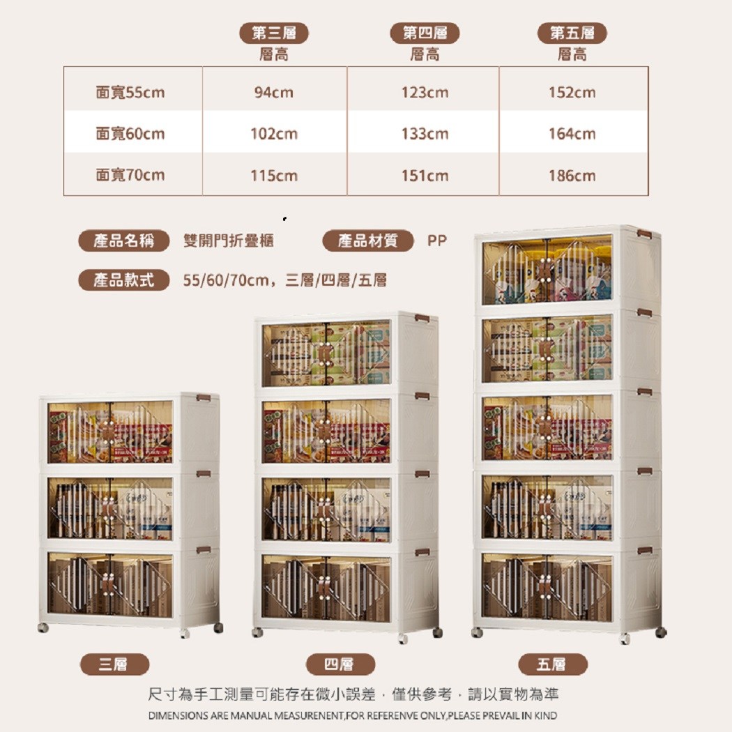這款雙開門折疊櫃主櫃,型號7274-5,款式為面寬60,是您居家收納的理想選擇。五層架子式設計,提供充足的儲物空間,無論是臥室、衣櫥、車庫、廚房、辦公室、客廳、浴室、兒童房、食品儲藏室、宿舍房、洗衣房還是遊戲室,都能輕鬆應對。採用可摺疊設計,方便收納不佔空間,附帶輪子,移動方便省力。透明窗口設計,讓您一目瞭然,快速找到所需物品。此外,還包含蓋子、輪子和扣件等組件,確保物品安全防塵,讓您的居家環境更加整潔有序。