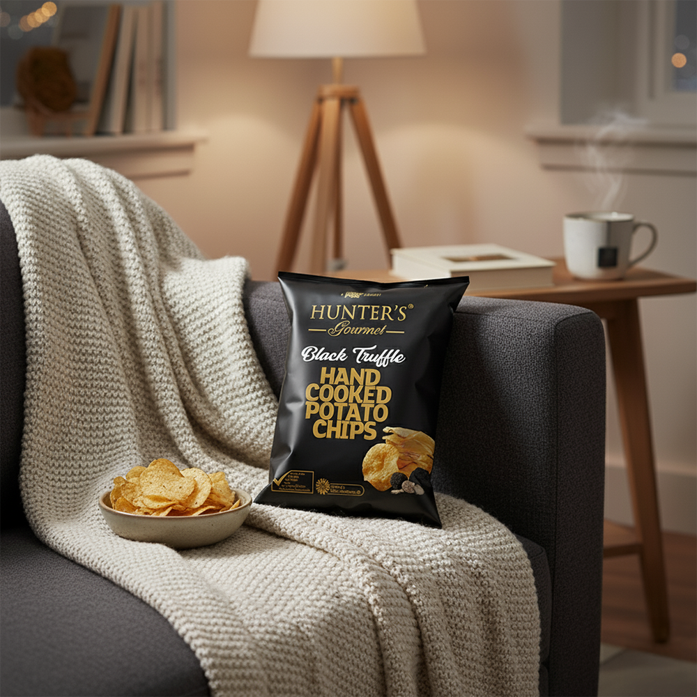 Hunter's Gourmet 黑松露味手工洋芋片,奢華享受從味蕾開始。嚴選優質馬鈴薯,以100%葵花油手工慢炸,每一片都酥脆可口,散發著濃郁的黑松露香氣。無麩質、無味精、非基因改造,不含人工色素及防腐劑,讓您安心享受美味。獨立包裝,方便攜帶,隨時隨地都能品嚐到頂級的味覺饗宴。無論是獨自享用,或是與親朋好友分享,Hunter's Gourmet 黑松露味洋芋片都是您的最佳選擇。