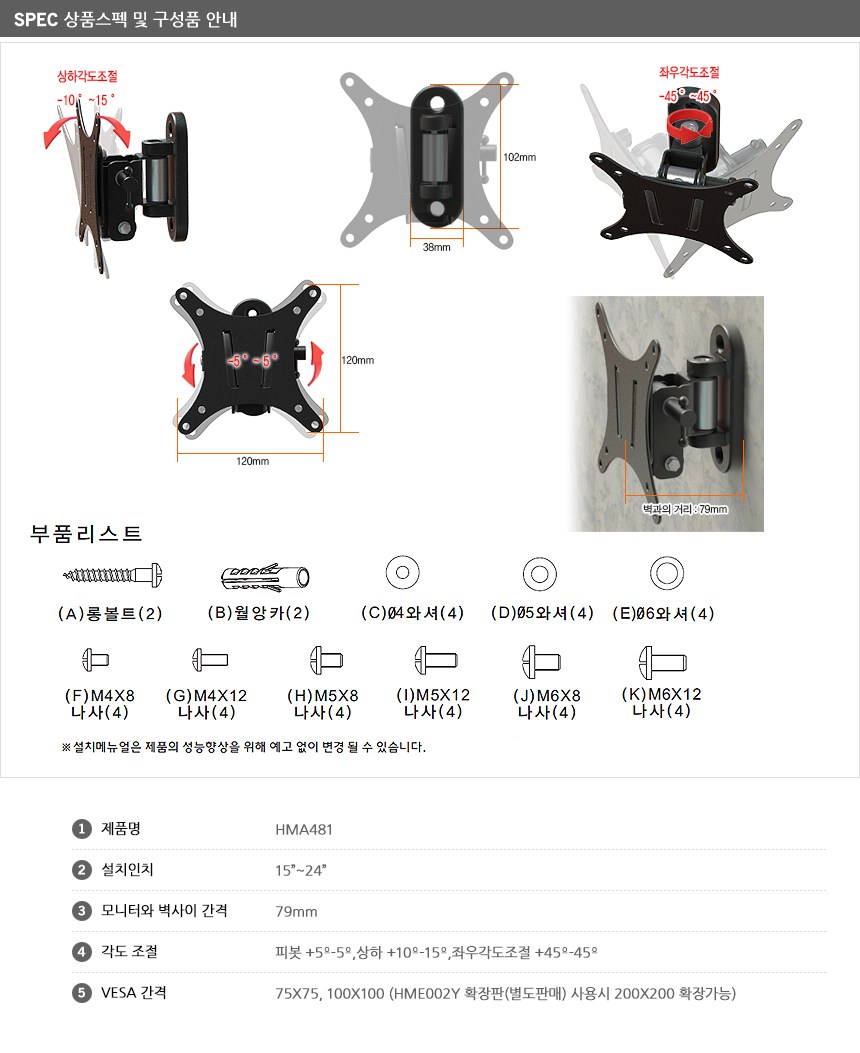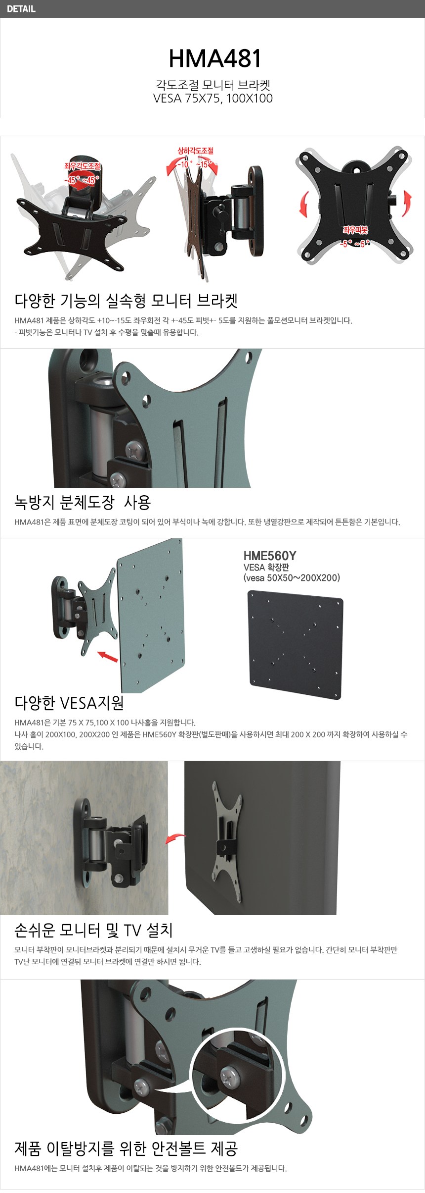 HYB 上下左右全動作關節型螢幕支架 HMA481,採用全動態設計,可輕鬆調整螢幕的上下、左右角度,以及旋轉角度,提供最佳的觀看體驗。此支架適用於 15吋至 24吋的螢幕,支援 VESA 75x75 及 100x100 標準,並可透過擴充板支援至 200x200。採用冷軋鋼板製成,堅固耐用,表面經過防鏽粉體塗裝處理,能有效防止腐蝕和生鏽。安裝簡便,附有安全螺栓,確保螢幕穩固不脫落,讓您使用。