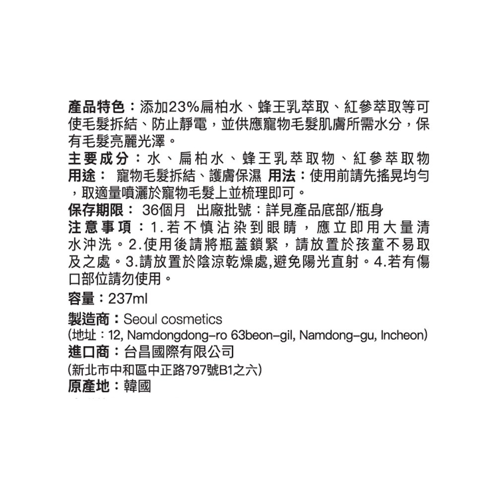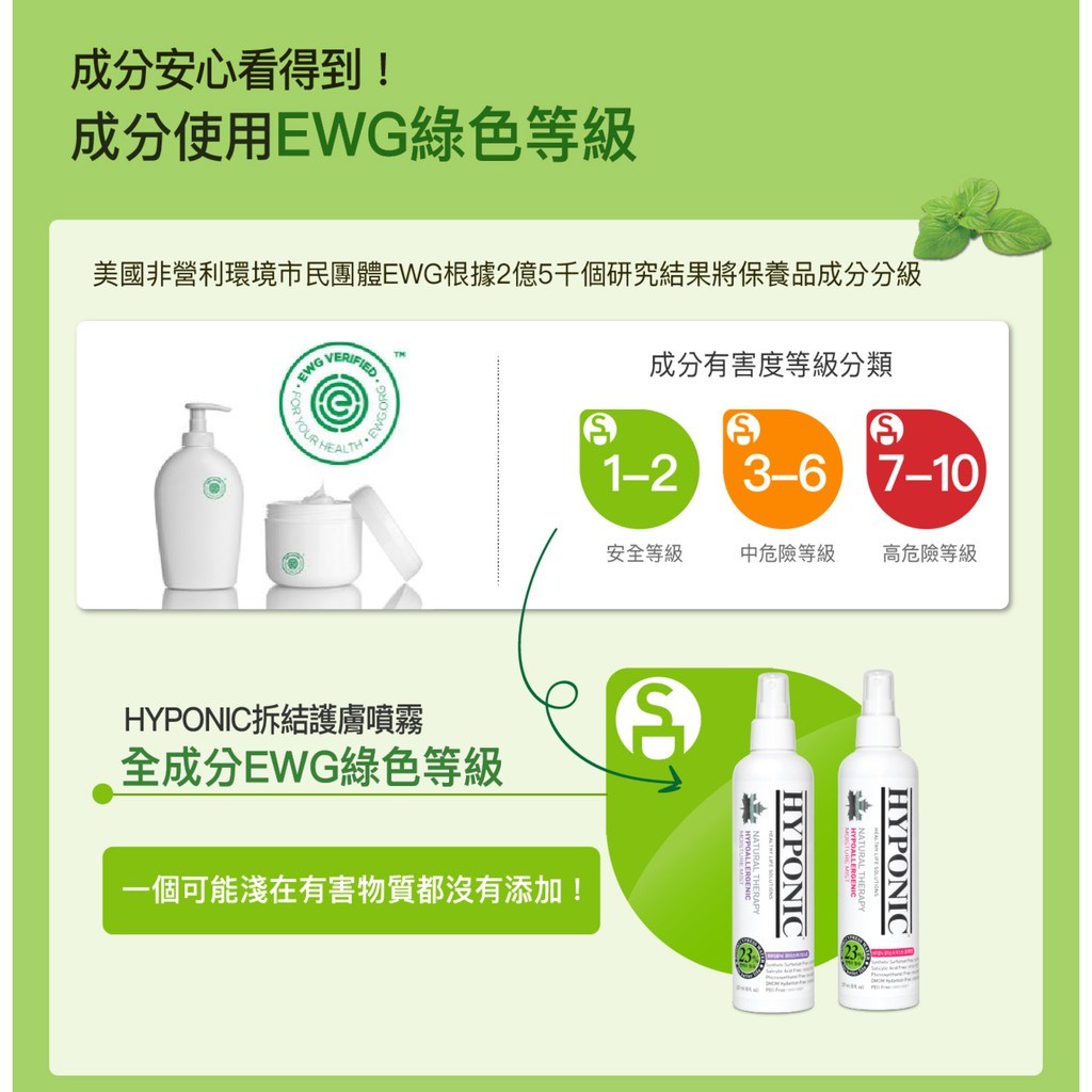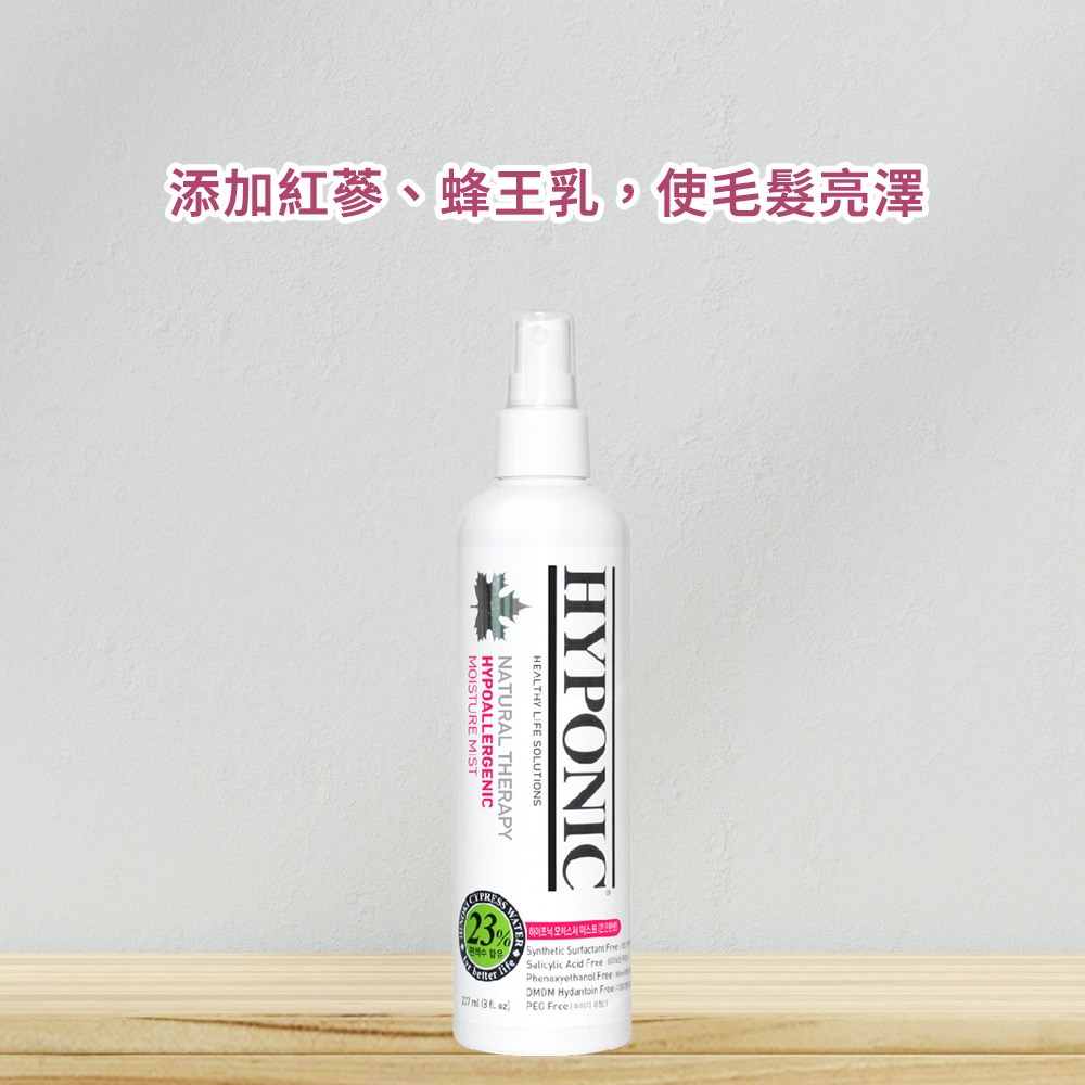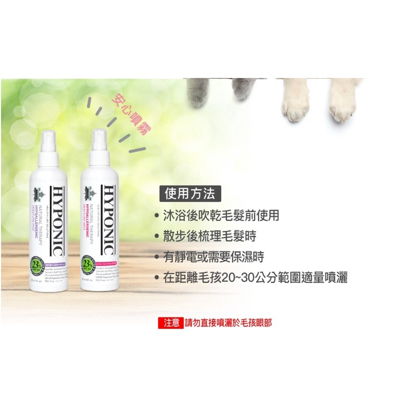 Hyponic 極致低敏拆結護膚保濕噴霧,為您的愛犬提供最溫和的呵護,能有效解決毛髮打結問題,同時深層滋潤毛髮和皮膚,讓毛髮恢復光澤亮麗。其低敏配方特別適合敏感膚質的狗狗,使用EWG綠色等級成分,不含任何有害物質,讓您安心使用。使用方法簡單,只需在距離毛孩20-30公分處適量噴灑,即可輕鬆梳理毛髮,隨時保持毛髮柔順保濕。無論是沐浴後、散步後,或是毛髮乾燥時,都能隨時使用,讓您的愛犬時刻保持最佳狀態。