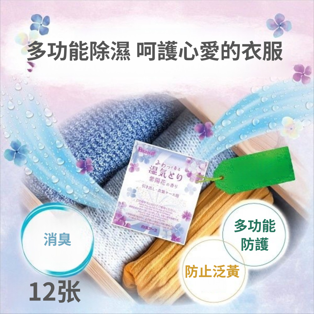 Hakugen Earth 白元 抽屜用除濕片,採用紫陽花香氛,能有效去除抽屜內的濕氣,並散發淡淡花香,讓您的抽屜保持乾爽舒適。片狀設計輕巧方便,不佔空間,適用於各種抽屜、衣櫃等收納空間。添加防霉成分,抑制黴菌滋生,保護您的衣物免受黴菌侵害。每包含有12片除濕片,經濟實惠,持久耐用,是您居家除濕的好幫手。