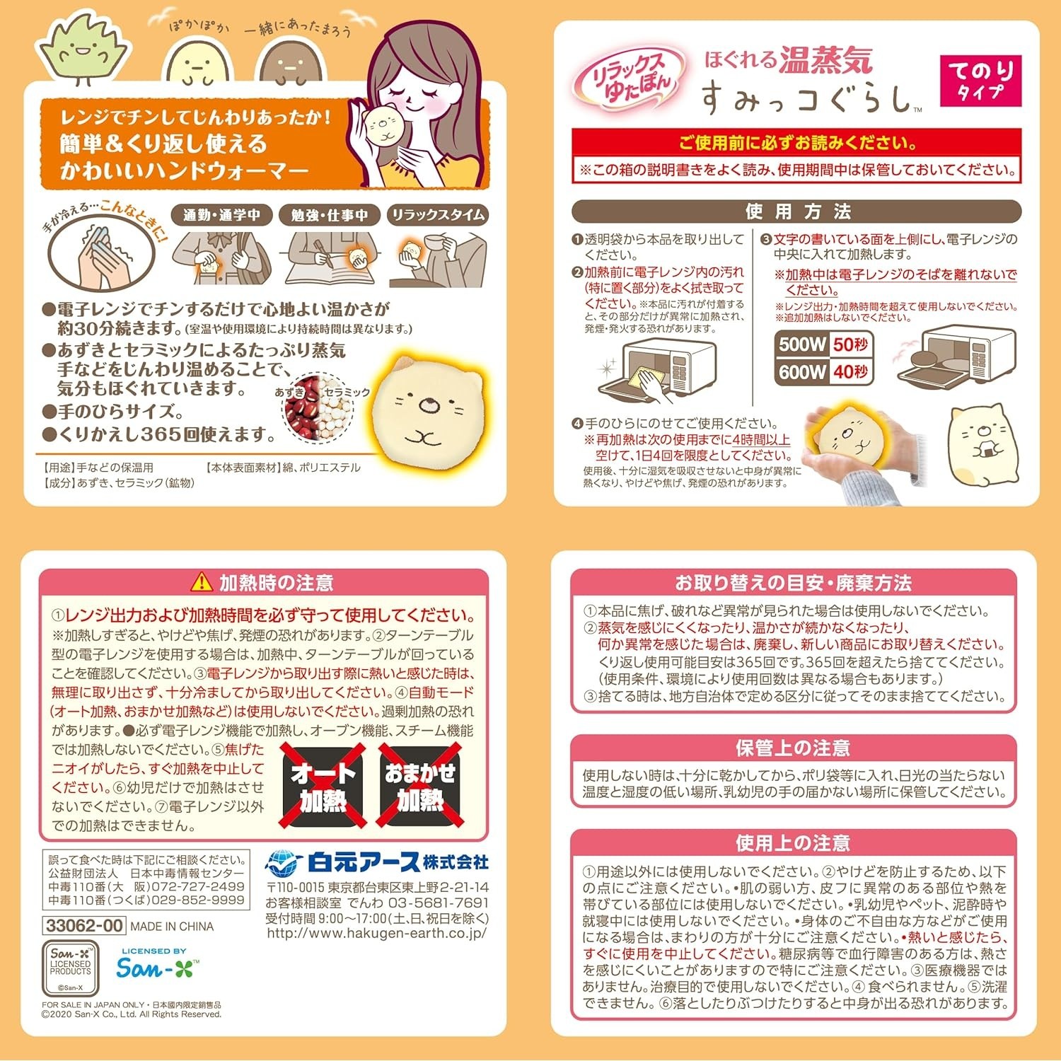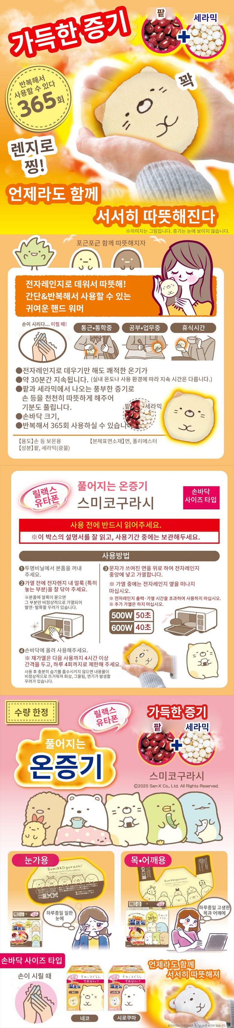 白元Relax Yutapon舒緩溫熱蒸氣暖手寶,可愛的角落生物貓咪造型,讓您愛不釋手。只需放入微波爐簡單加熱,即可享受約30分鐘的溫暖感受,舒緩您的身心。內含紅豆與陶瓷,透過蒸氣的熱力,溫暖您的雙手。可重複使用約365次,經濟又環保。是您在通勤、工作或休息時的最佳保暖夥伴。