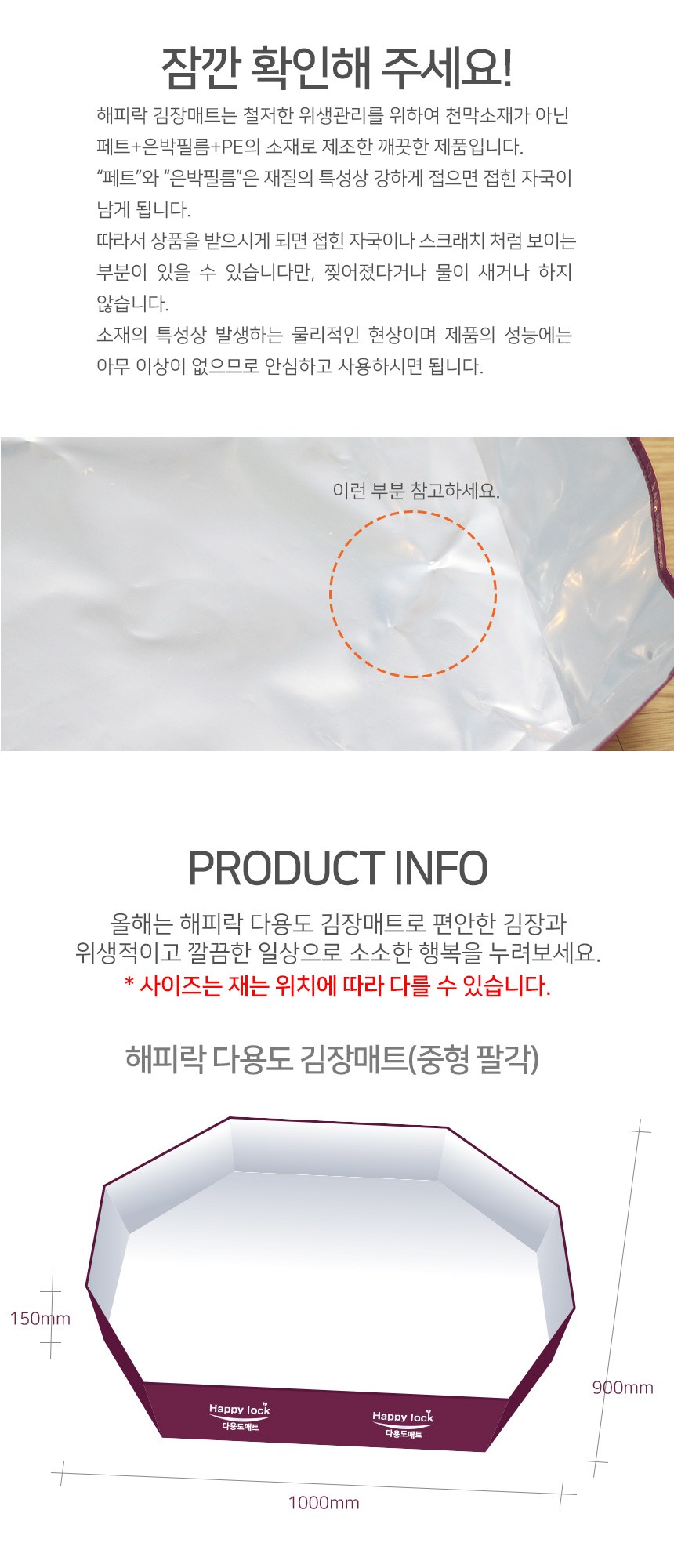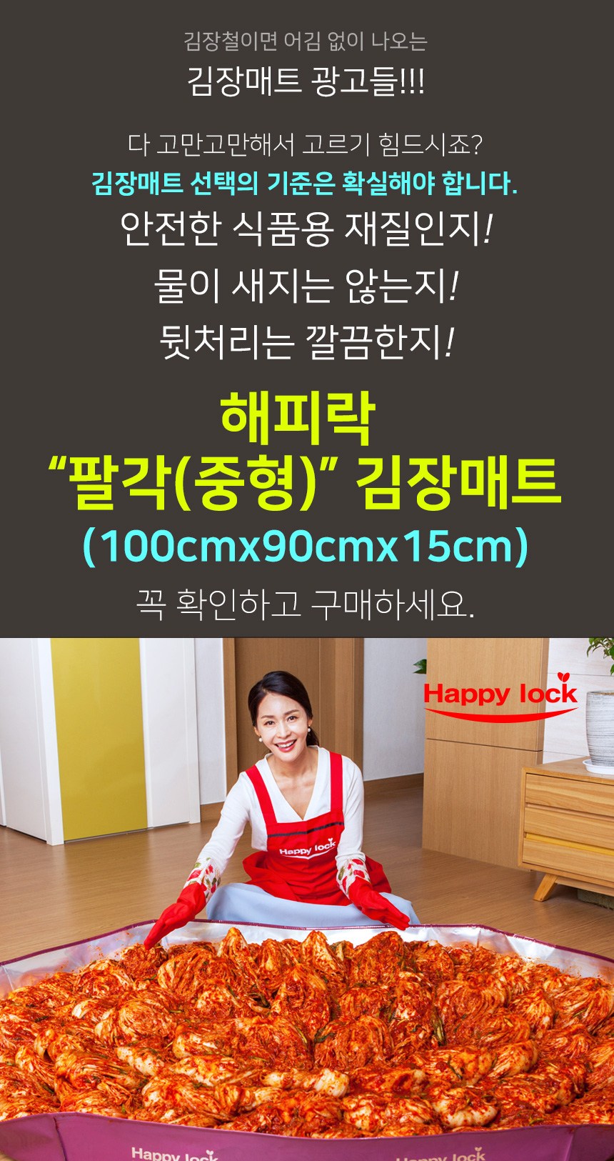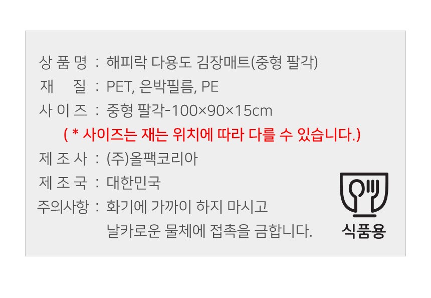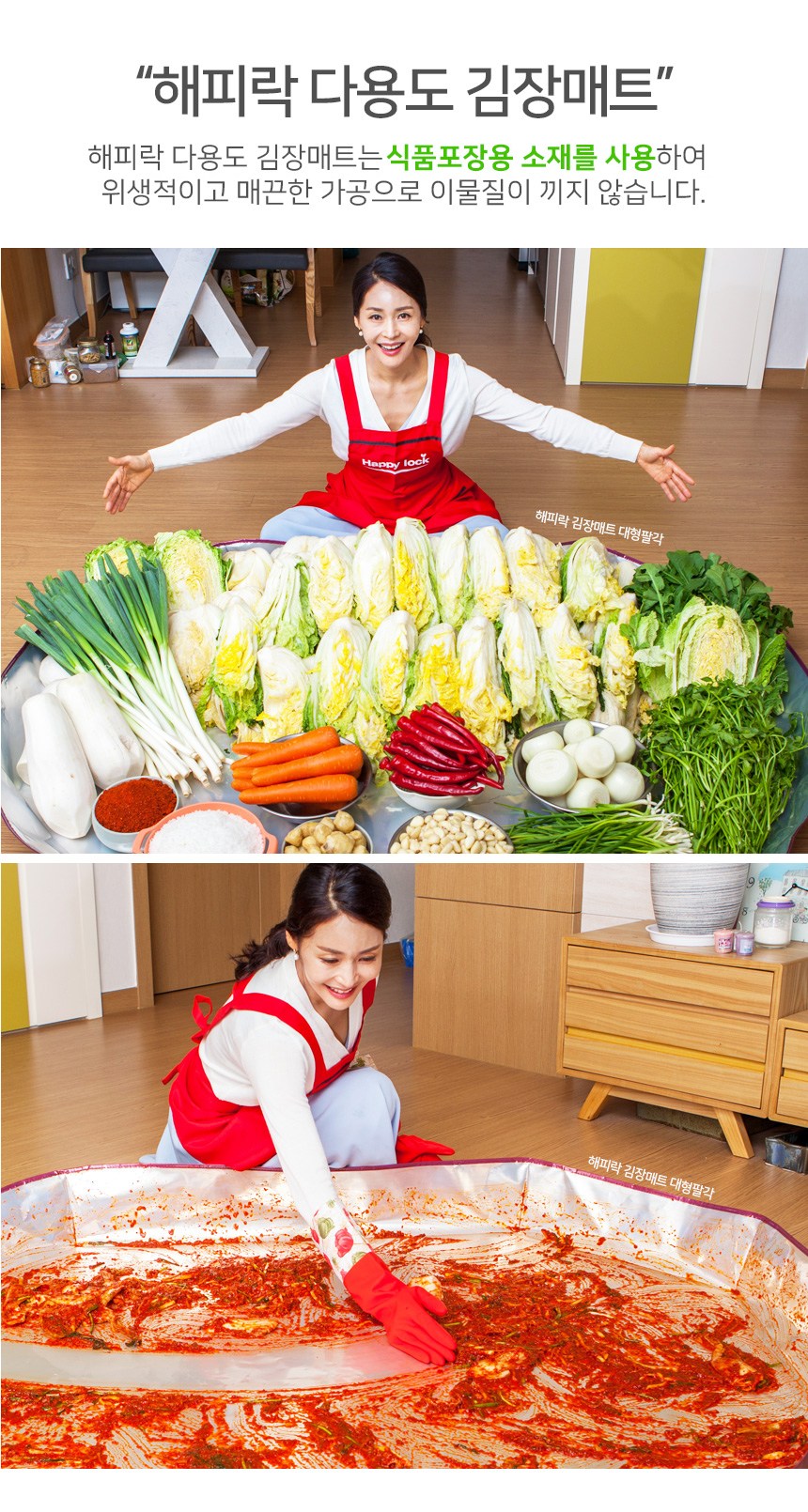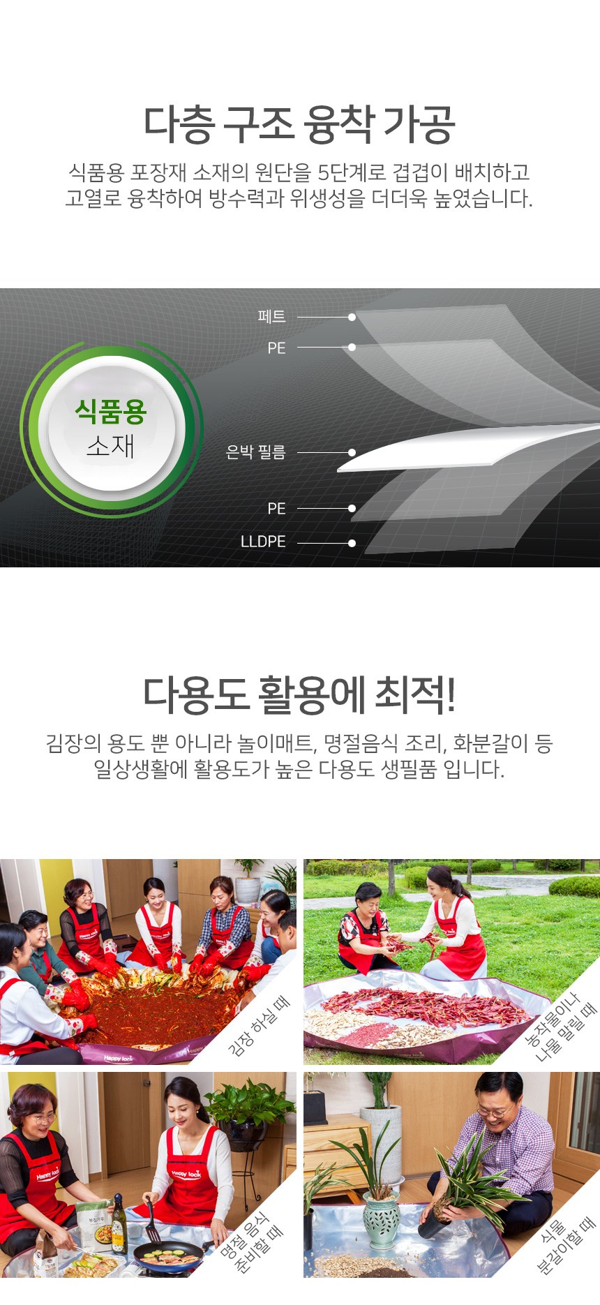 Happy Lock多用途醃泡菜墊採用食品級包裝材料,加工衛生且表面光滑,不易殘留異物。底部無接縫的一體成型設計,完全不用擔心漏水問題。多層結構熔接加工,將食品用包裝材料的布料分五層堆疊,並以高溫熔接,進一步提高了防水性和衛生性。不僅可用於製作韓式泡菜,還可用於遊戲墊、烹飪節日食品、換盆等,是日常生活中用途廣泛的多功能生活用品。今年就用Happy Lock多功能泡菜墊,享受舒適的泡菜製作和衛生乾淨的日常生活。