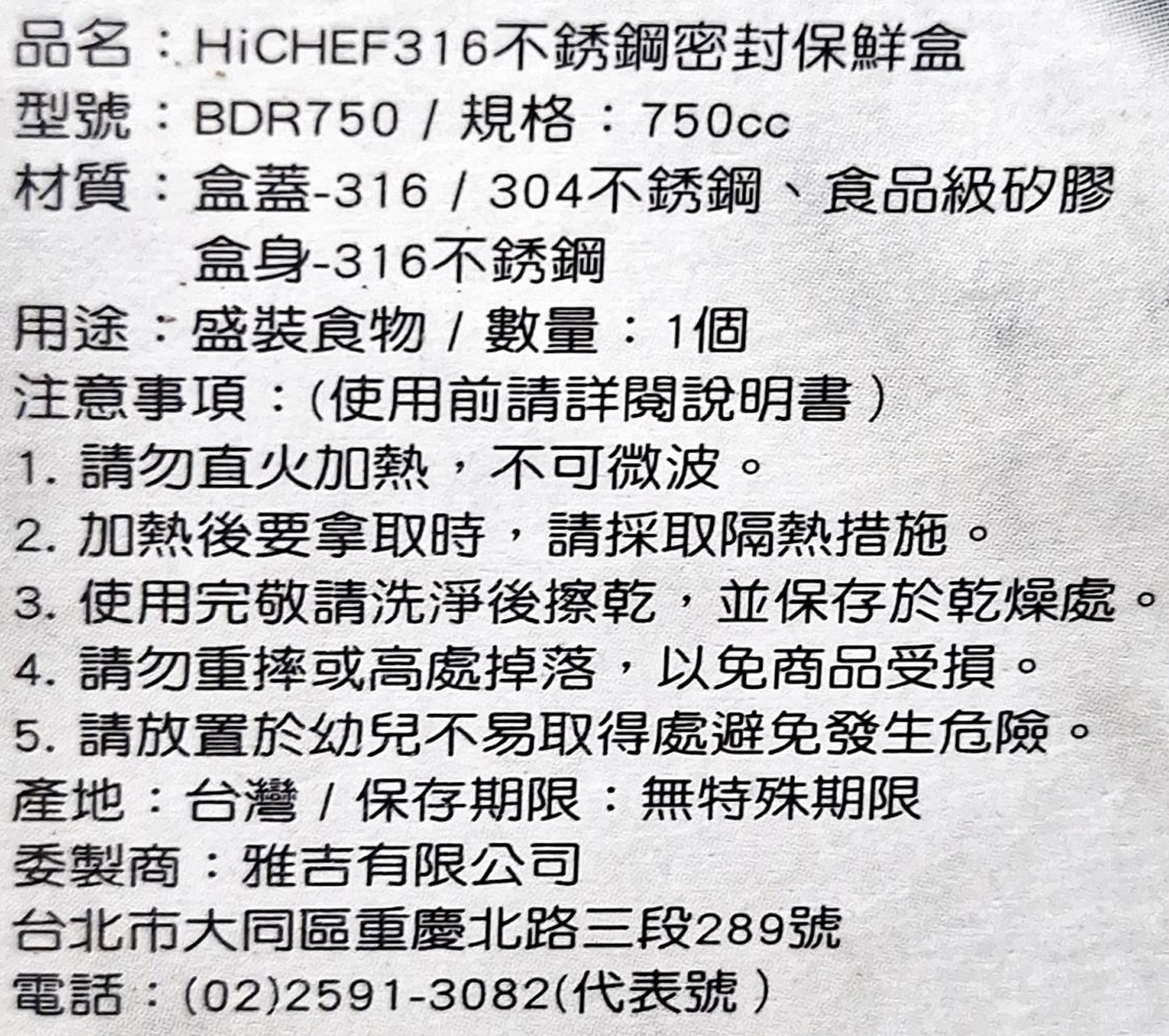 HiCHEF 掌廚 316不銹鋼密封保鮮盒,為您提供安全、耐用的食品儲存方案。採用頂級316不銹鋼材質,具有卓越的耐腐蝕性和耐酸鹼性,確保食材的新鮮與安全。750c.c.的容量適中,無論是存放午餐、剩菜或準備食材都非常方便,讓您隨時享受美味。不僅適用於冰箱、洗碗機,甚至烤箱和電鍋,一盒多用,輕鬆應對各種烹飪和儲存需求。掌廚保鮮盒是您廚房和外出用餐的理想選擇,讓您的生活更加健康便利。