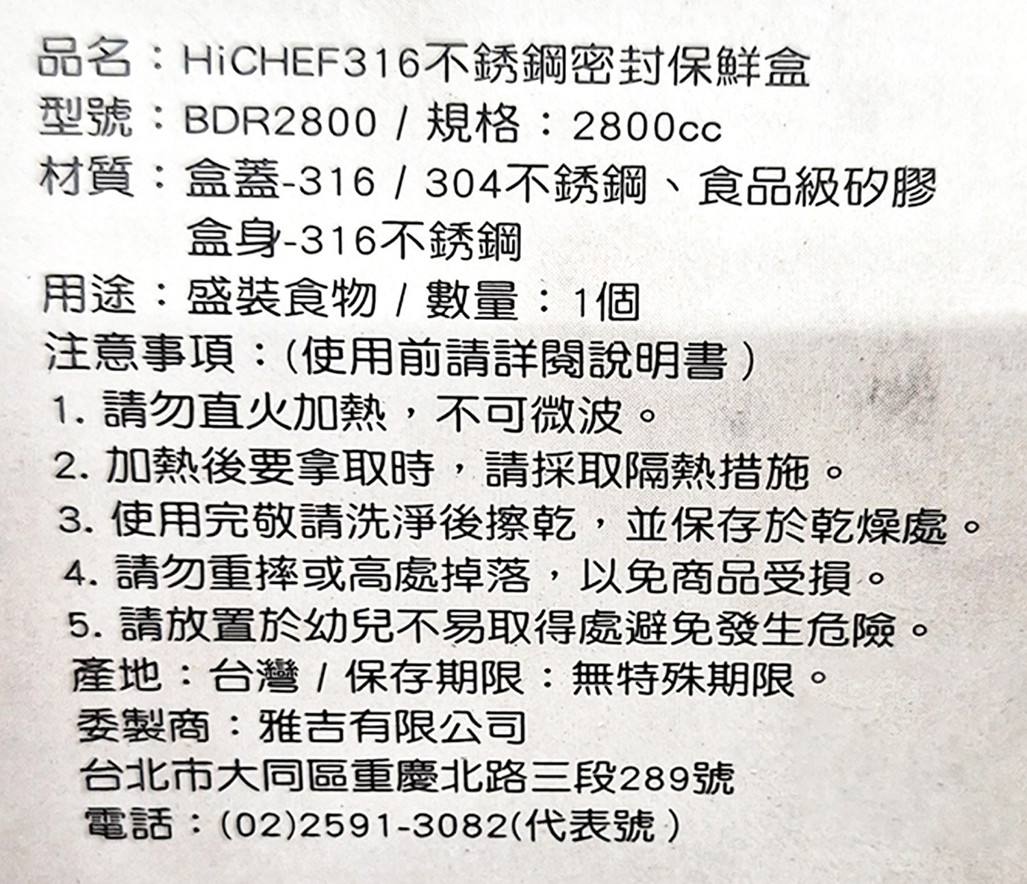 HiCHEF 掌廚 316不鏽鋼密封保鮮盒,是您廚房和冰箱的理想收納幫手。這款2.8L的保鮮盒採用食品級316不鏽鋼製成,耐腐蝕、耐酸鹼,且硬度更高,確保食材安全無虞。密封設計有效隔絕異味,讓您安心存放各種美食。一體成型的盒身易於清洗,不易藏污納垢,保持衛生。無論是食材保鮮、電鍋蒸煮,還是烤箱烘焙,它都能輕鬆應對,是您居家和戶外野餐的得力助手。