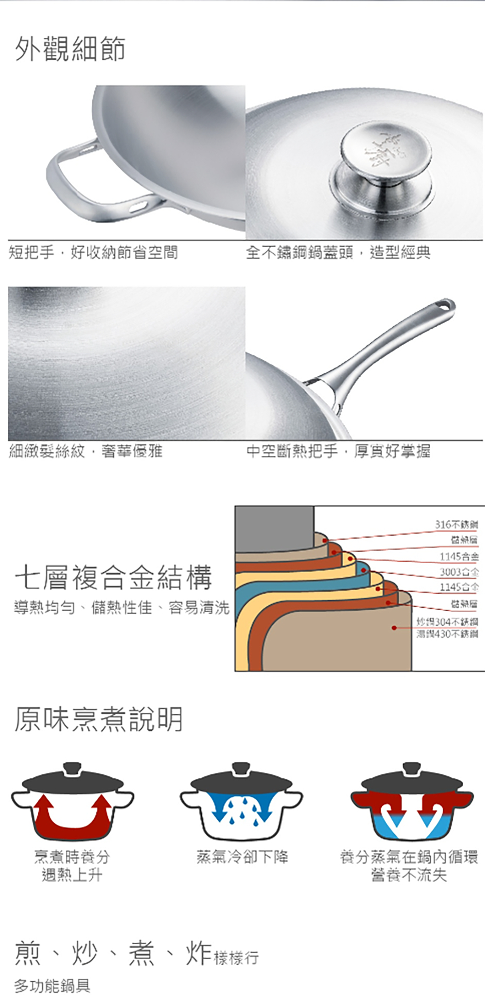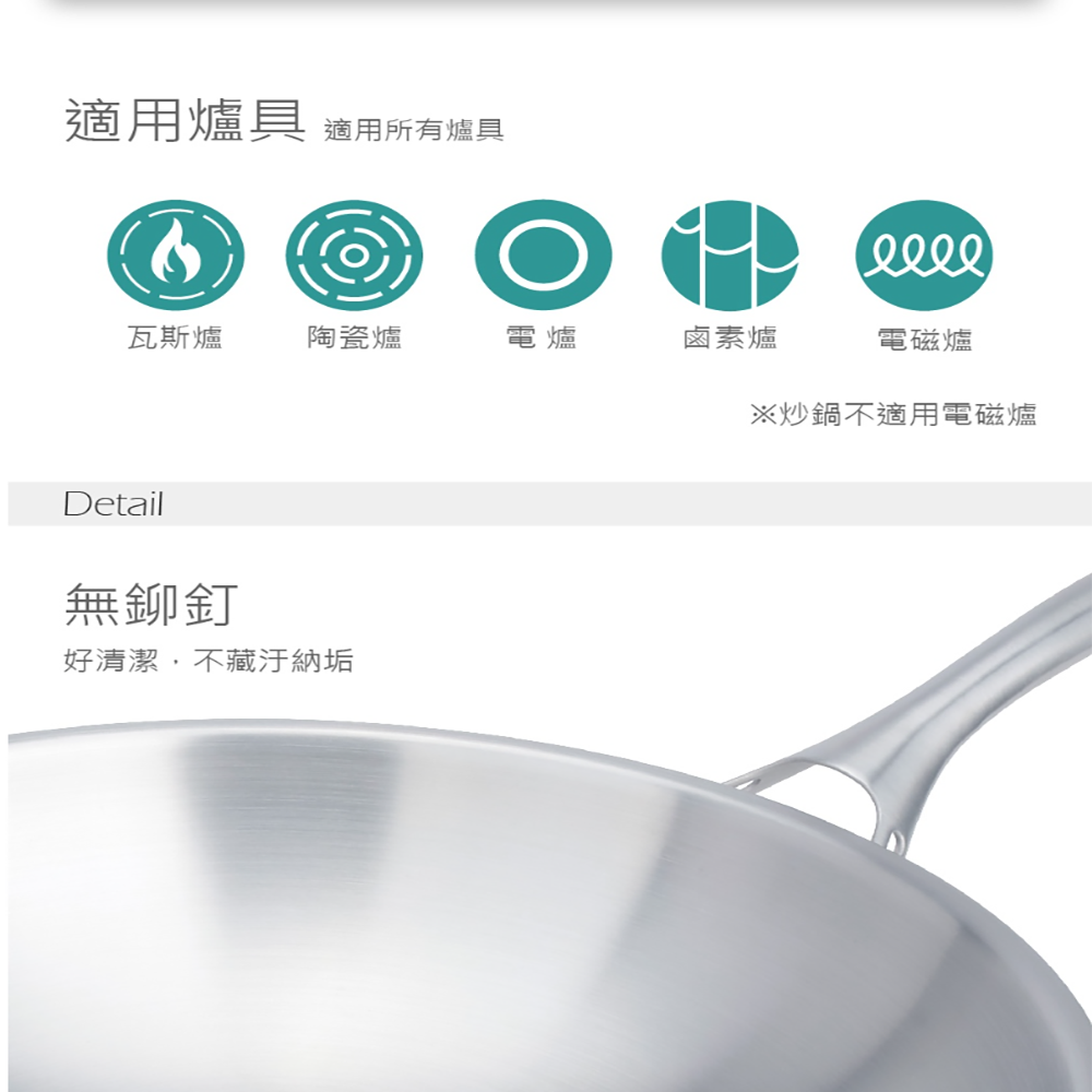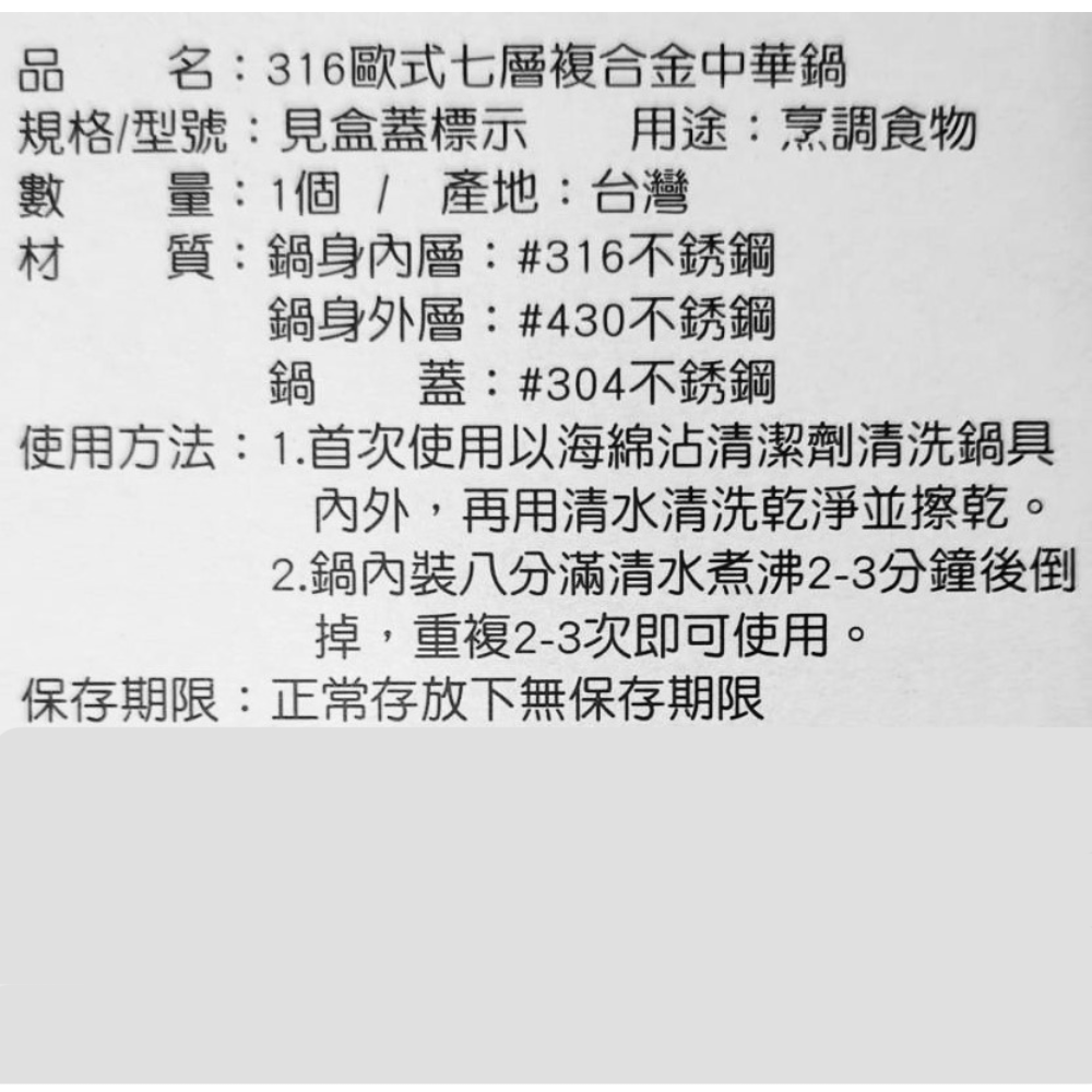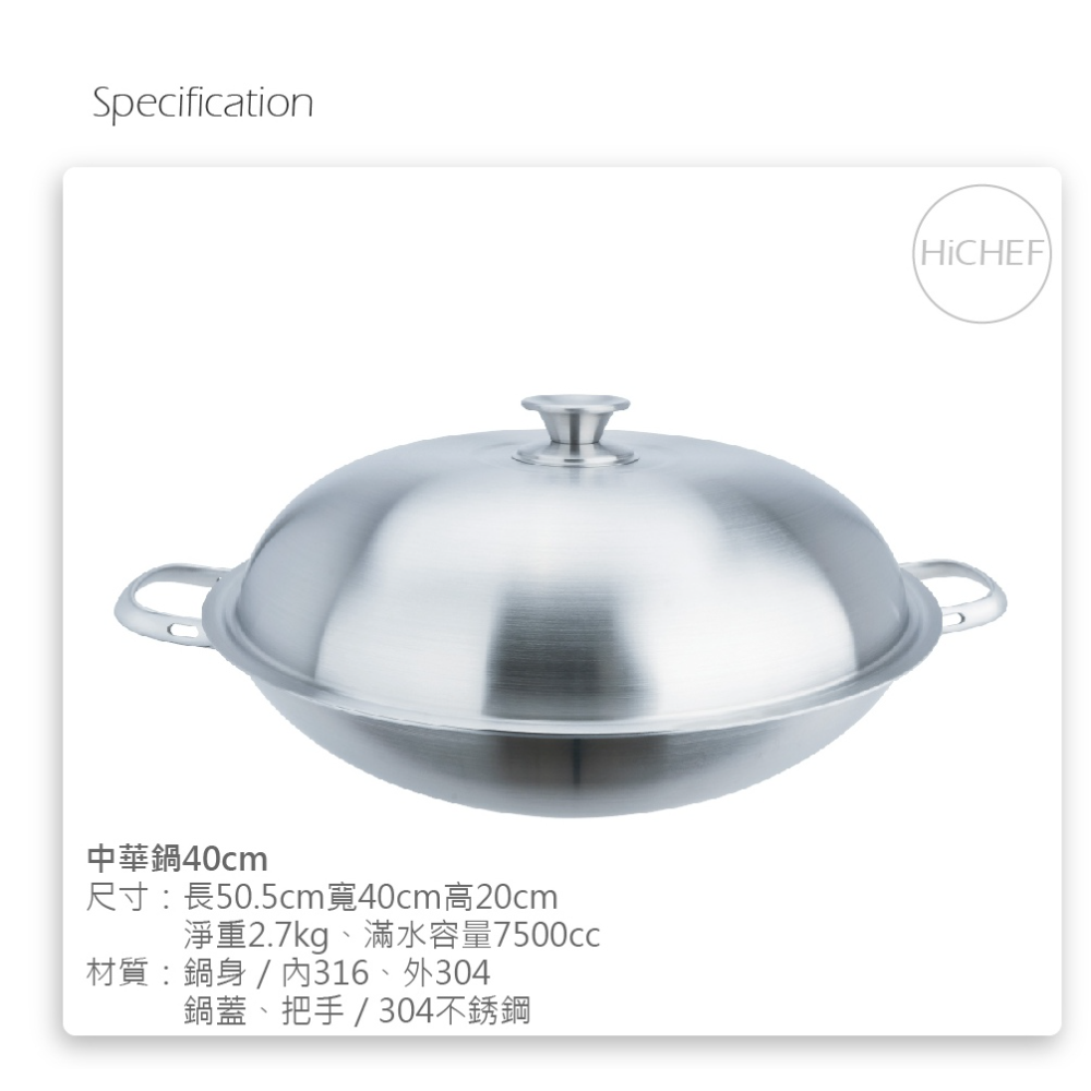 Hi CHEF 掌廚 316不鏽鋼雙炳中華鍋,採用優質316不鏽鋼材質,堅固耐用且安全無虞。七層複合金結構設計,導熱均勻快速,減少油煙產生,讓您輕鬆烹調健康美味的佳餚。無鉚釘設計,清洗方便,不易藏汙納垢。適用於多種爐具,包含瓦斯爐、陶瓷爐、電爐、鹵素爐,但不適用於電磁爐。無論是煎、炒、煮、炸,皆能輕鬆應對,是您廚房不可或缺的好幫手。