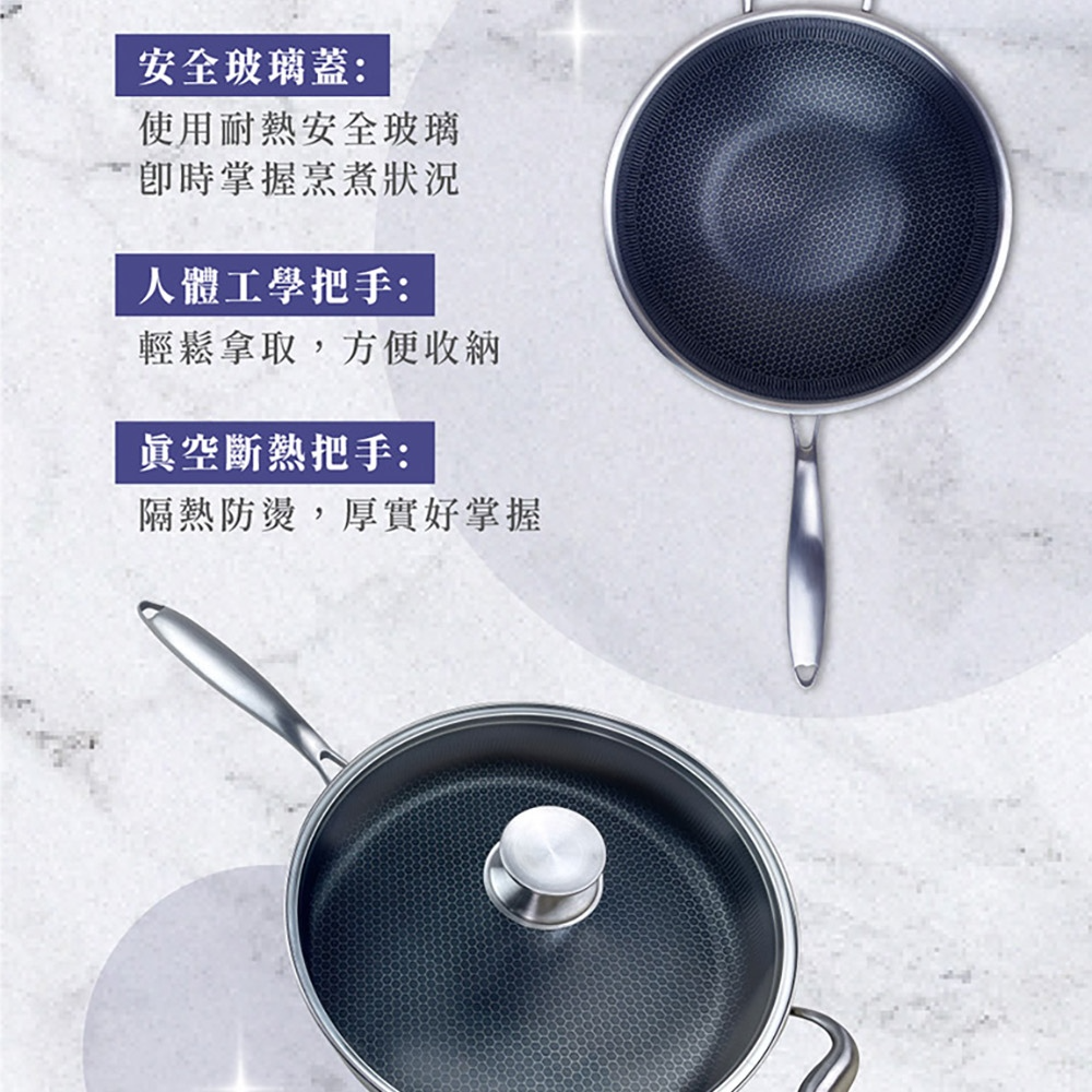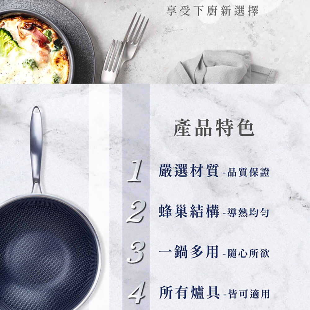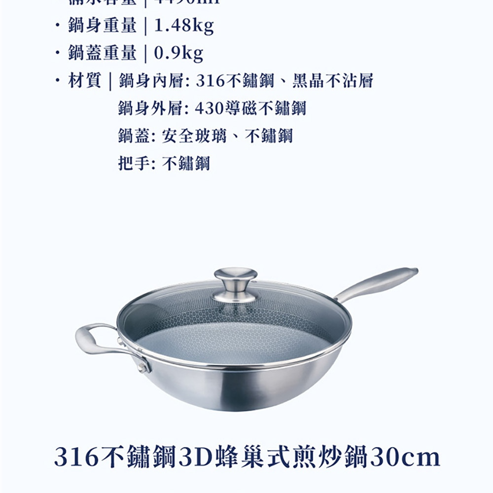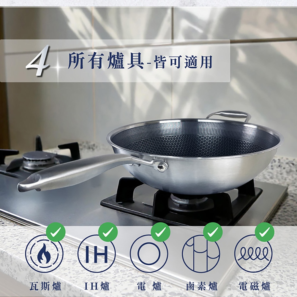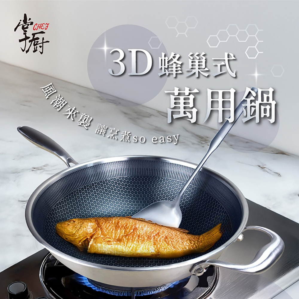 NS_HiCHEF掌廚316不鏽鋼蜂巢式煎炒鍋,採用316不鏽鋼材質。獨特3D蜂巢設計,減少食材沾黏,讓您輕鬆烹飪出美味佳餚。33公分大尺寸,適合家庭使用,煎、炒、炸樣樣皆宜。適用於所有爐灶,讓您在各種廚房環境都能輕鬆使用。輕鬆清潔保養,讓您的烹飪體驗更加愉快。