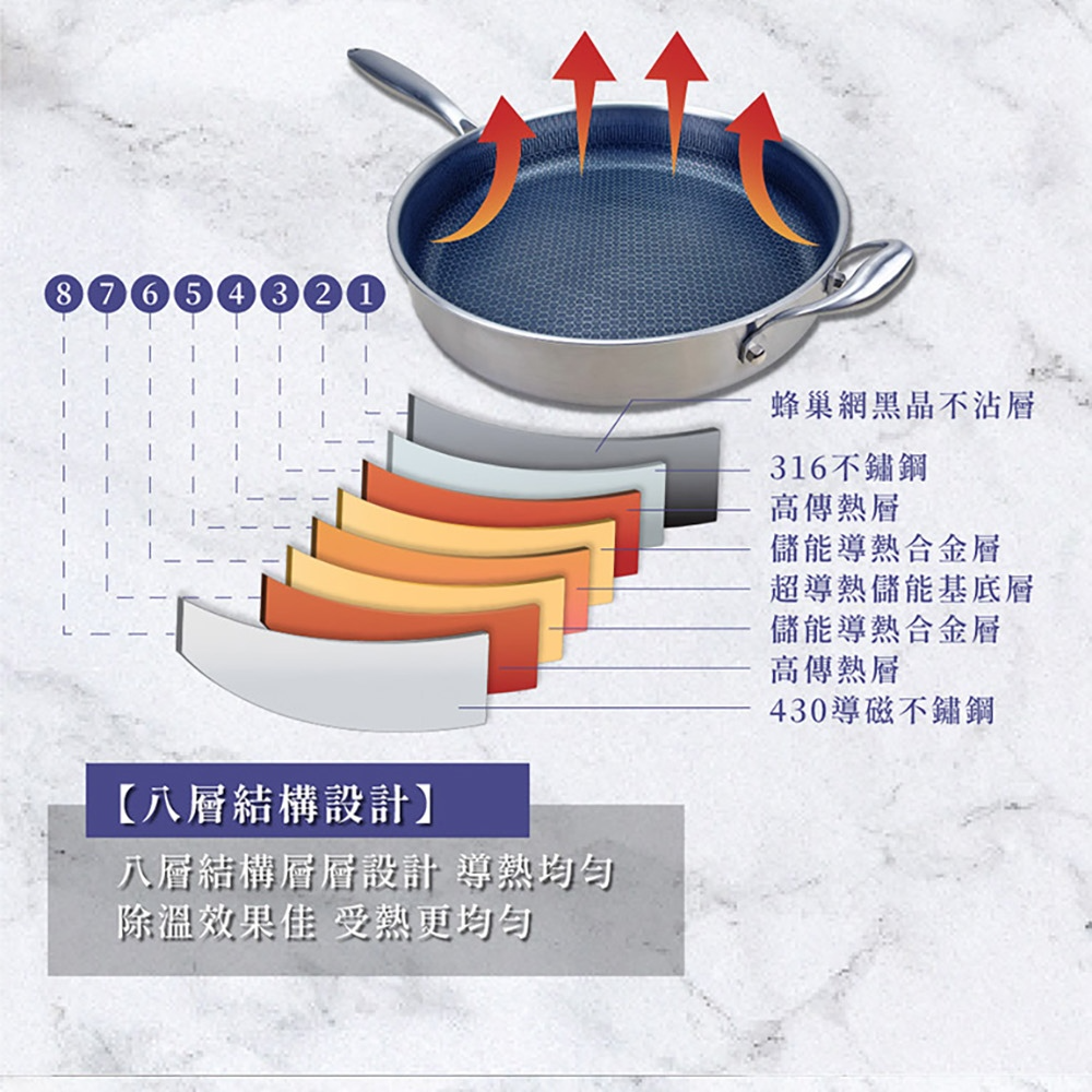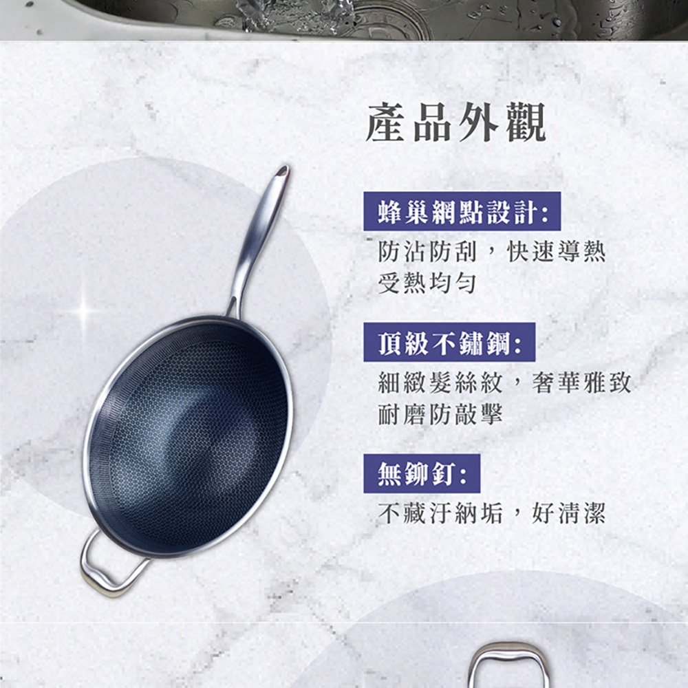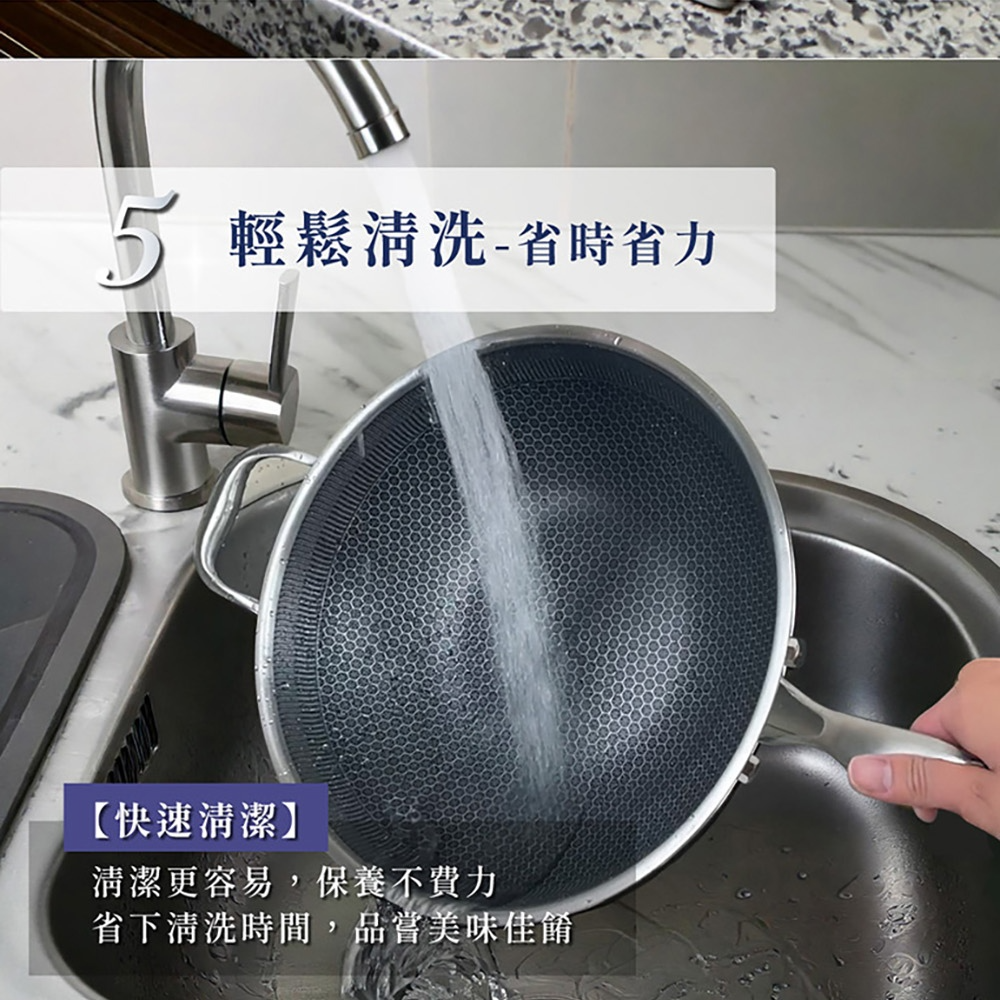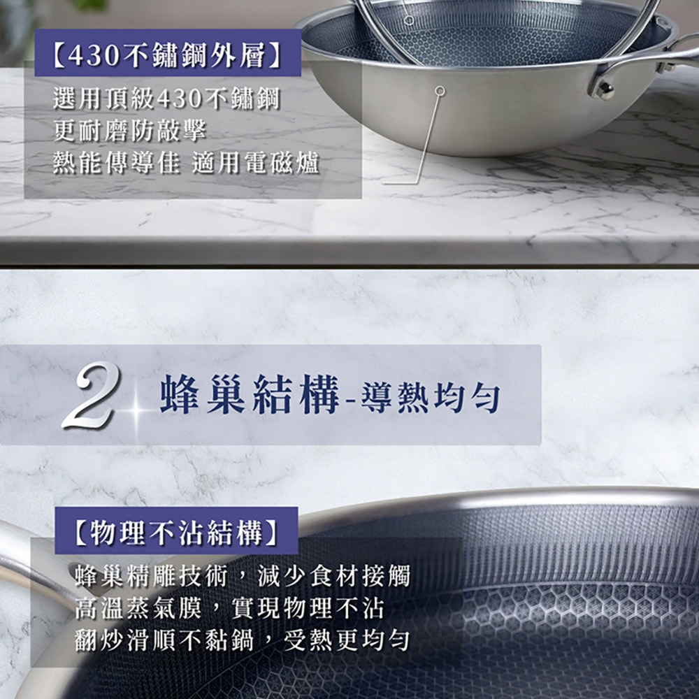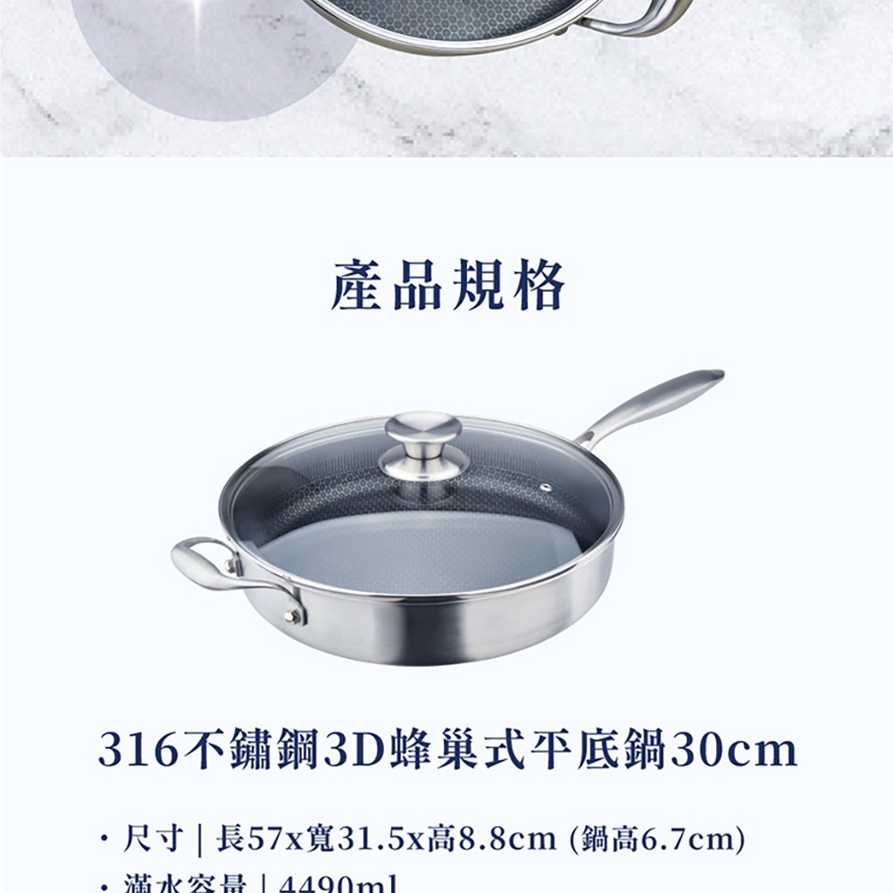 NS_HiCHEF掌廚316不鏽鋼蜂巢式煎炒鍋,採用316不鏽鋼材質。獨特3D蜂巢設計,減少食材沾黏,讓您輕鬆烹飪出美味佳餚。33公分大尺寸,適合家庭使用,煎、炒、炸樣樣皆宜。適用於所有爐灶,讓您在各種廚房環境都能輕鬆使用。輕鬆清潔保養,讓您的烹飪體驗更加愉快。