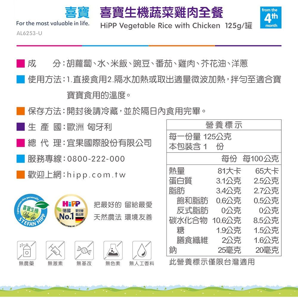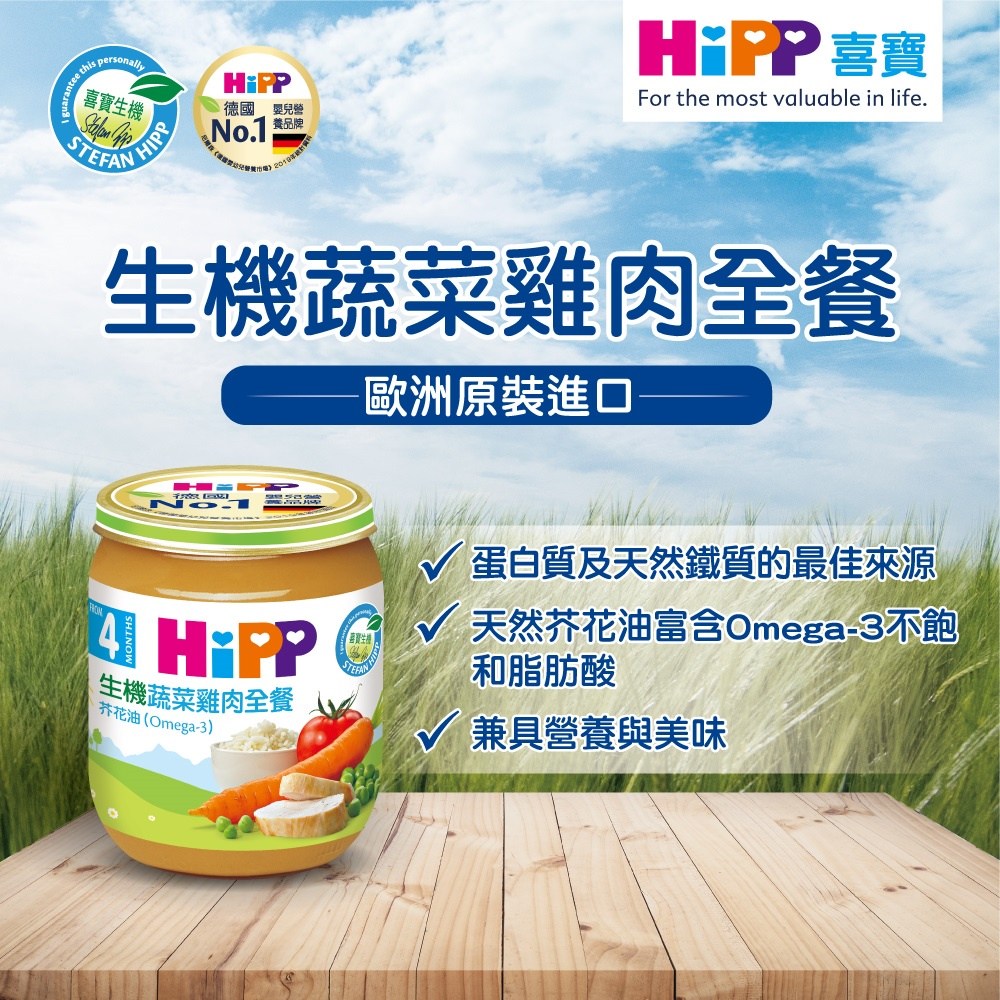 HiPP 喜寶蔬菜雞肉全餐是專為4個月以上寶寶設計的營養美味餐點,讓寶寶健康茁壯,富含Omega-3不飽和脂肪酸。每罐125g,一組6罐,常溫保存方便隨時餵食。HiPP喜寶堅持提供最優質的食品,讓寶寶吃得安心,媽媽放心。