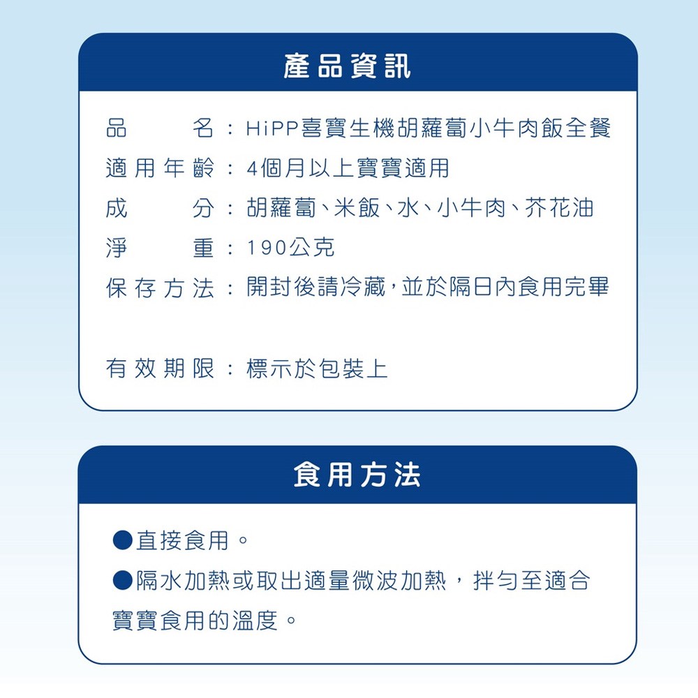 - 喜寶全餐提供多樣蔬菜與雞肉,口感細緻滑順,寶寶輕鬆吞嚥好消化。