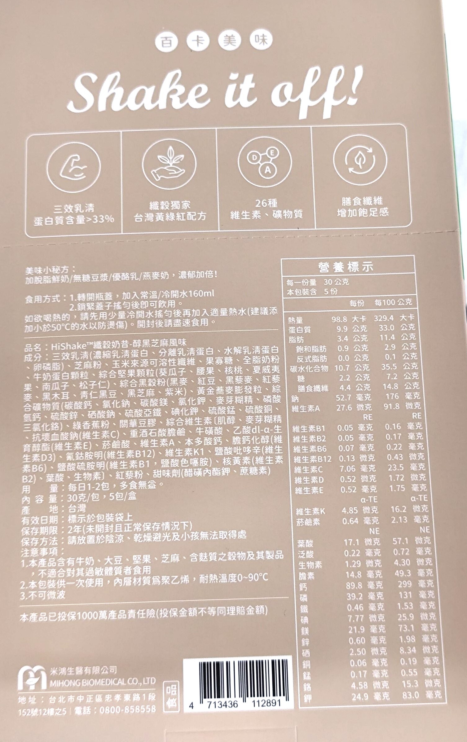 HiShake 纖穀奶昔醇黑芝麻風味,是您健康飲食的理想選擇。每包含有30克的醇黑芝麻風味奶昔,一盒共有5包,方便您隨時隨地補充營養。這款奶昔不僅提供豐富的蛋白質,有助於增加飽足感,還含有多種維生素和礦物質,為您的身體提供全面的營養支持。無論是早餐、午餐還是運動後,HiShake 纖穀奶昔都能為您提供美味又健康的能量來源。讓您輕鬆享受健康生活,隨時保持活力充沛。