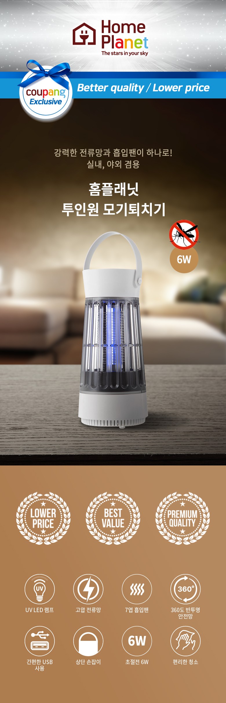 Home Planet二合一滅蚊器結合了電擊式和吸入式兩種滅蚊方式,提供更全面的防護。它利用UV LED燈釋放蚊子喜愛的波長,有效吸引蚊蟲靠近,再透過高壓電網強力電擊。內建的七葉吸入風扇能迅速將被吸引的蚊子吸入,達到更佳的滅蚊效果。產品設計輕巧,方便攜帶,無論室內室外皆可使用。操作簡單,只需連接USB電源即可,是居家防蚊的理想選擇。
