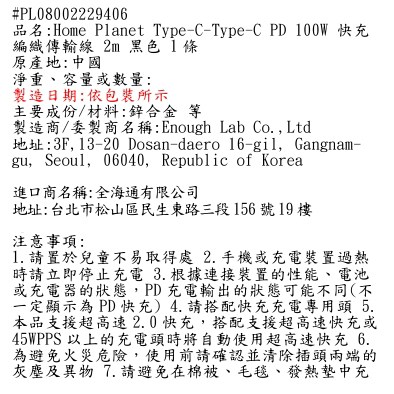 Home Planet TYPE-C到TYPE-C PD充電線,支援最高100W功率輸出,讓您的設備迅速恢復電力。2公尺的線長設計,提供您更大的使用彈性,無論在家中或辦公室都能輕鬆充電。採用E-Marker晶片組,能自動調整電流,確保充電過程穩定安全。高耐用性的尼龍編織線材,有效防止斷裂和纏繞,延長產品使用壽命。同時支援480Mbps的資料傳輸速度,方便您快速傳輸檔案。