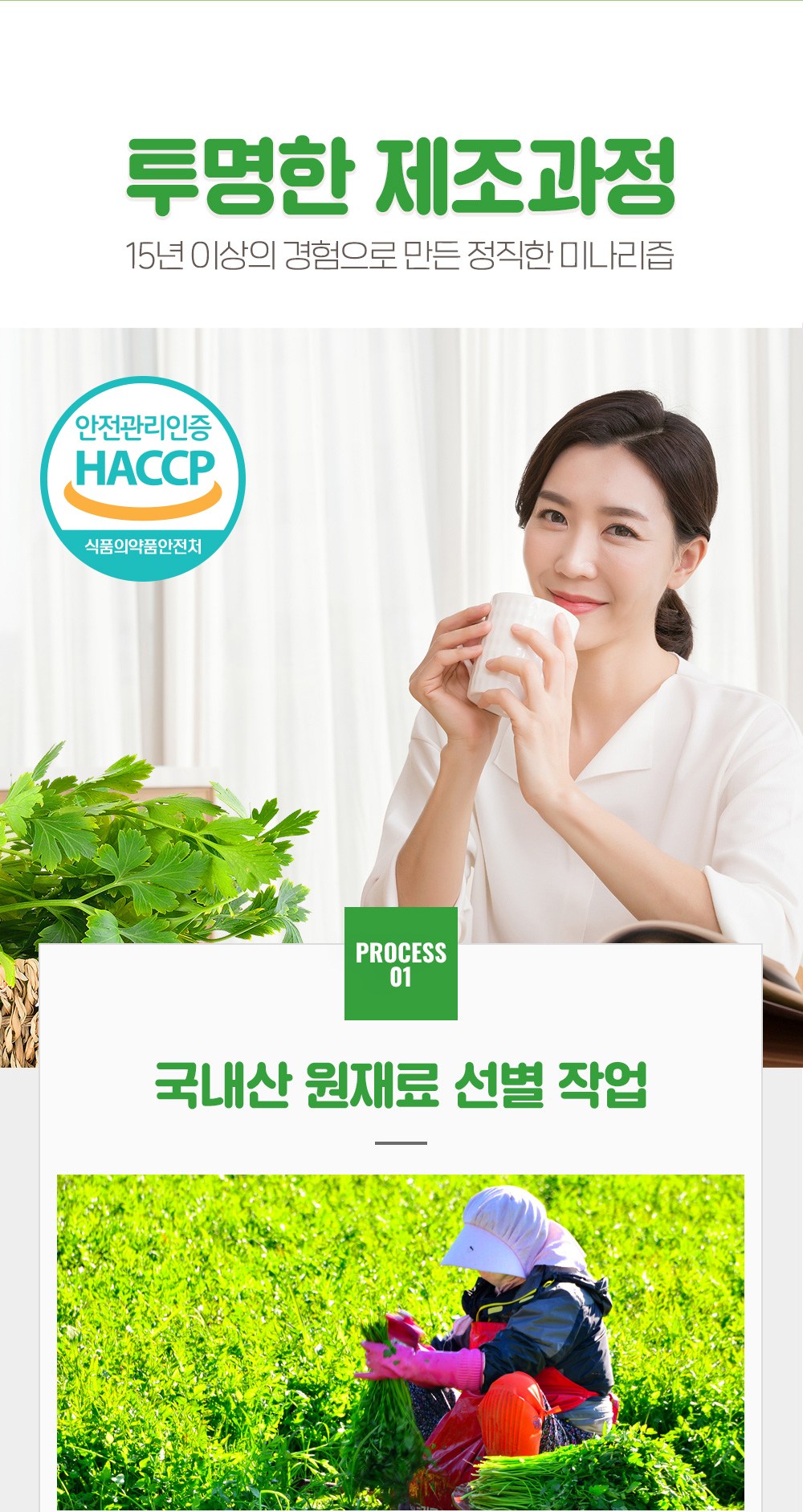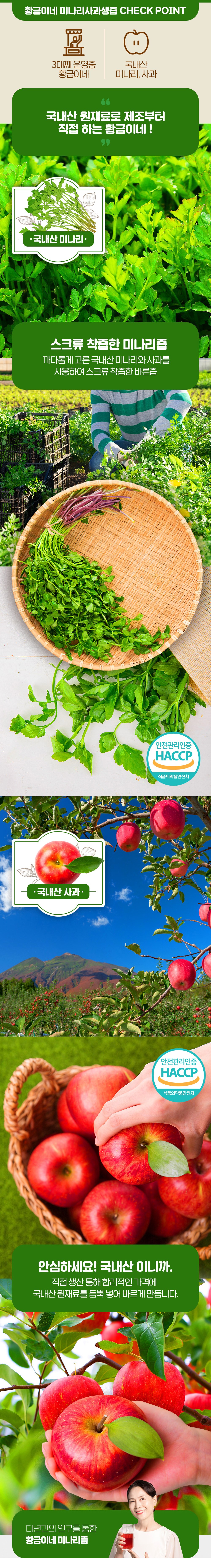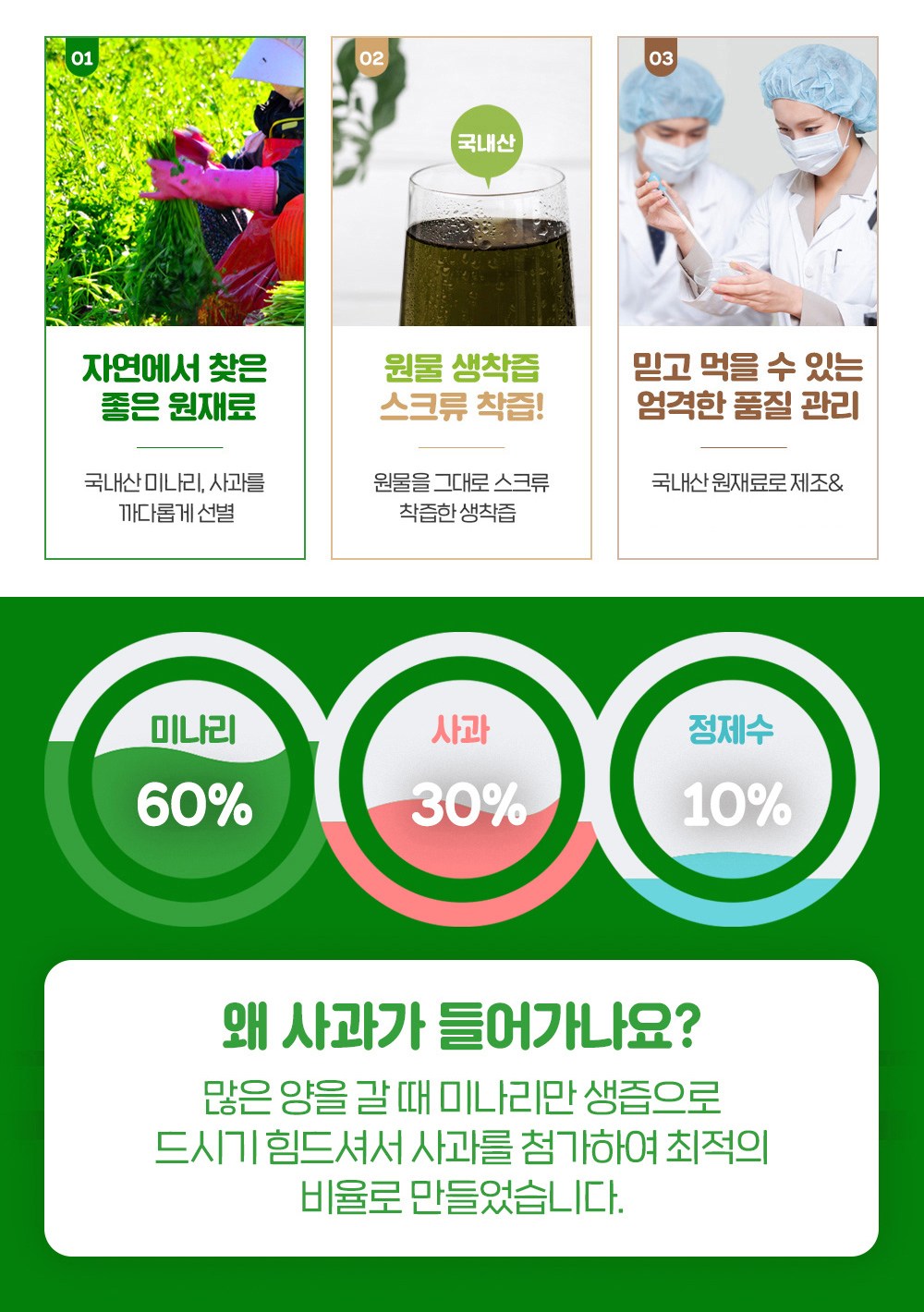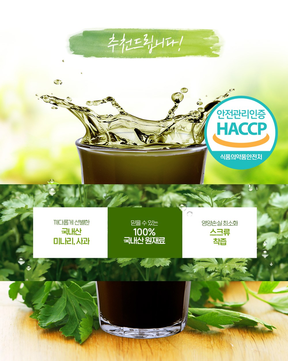 - 不添加額外成分,僅用水芹與蘋果調和,口感清爽,適合各年齡層,是全家人的健康選擇。