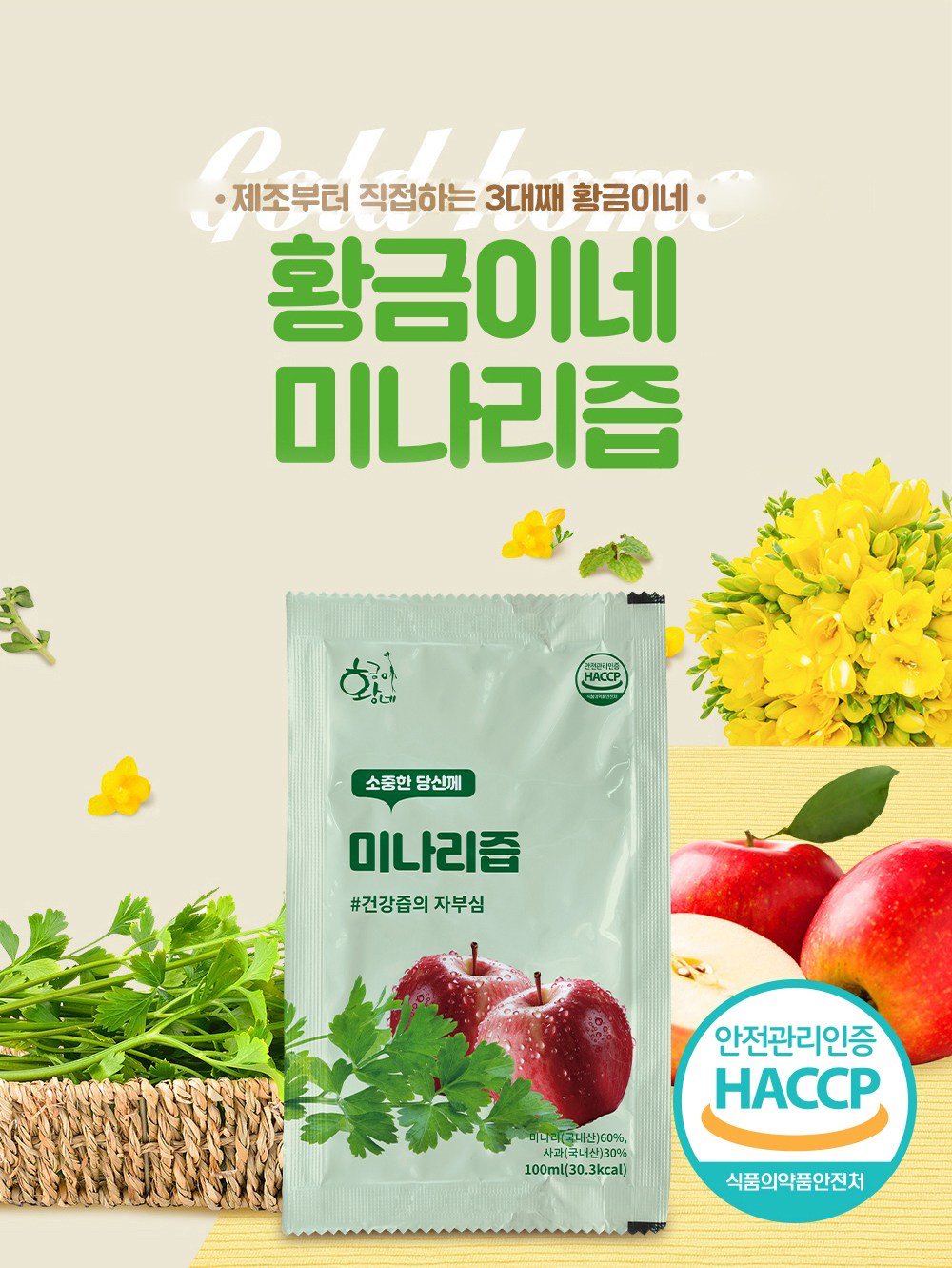 黃金家水芹菜汁隨身飲,嚴選韓國產水芹與蘋果,透過螺旋壓榨技術,完整保留食材的營養與風味。獨立包裝設計,方便您隨時隨地補充健康能量。這款健康飲品不添加額外成分,口感清爽,適合全家大小一同享用。經過HACCP食品安全管理認證,讓您安心飲用。無論是忙碌的上班族或是注重健康的家庭,黃金家水芹菜汁都是您健康生活的好夥伴。