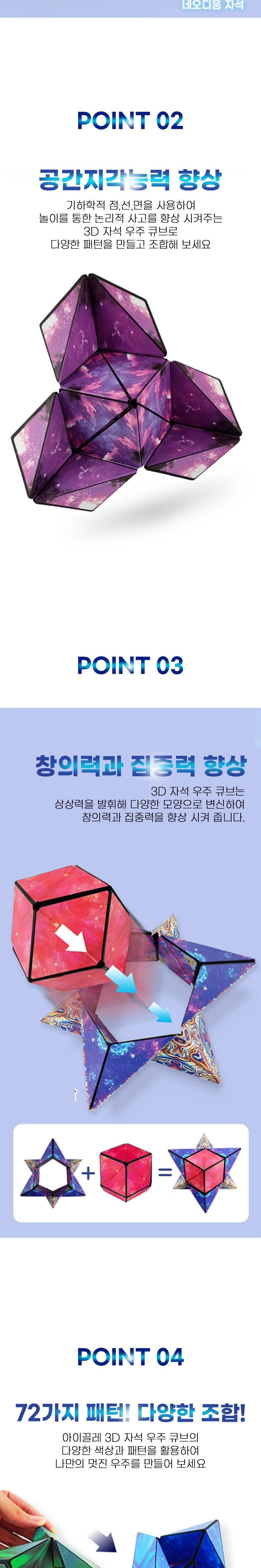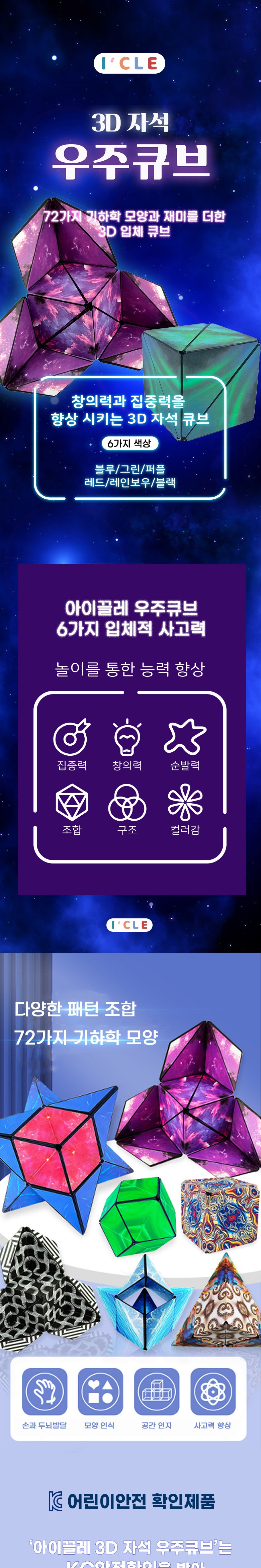 I'CLE 3D磁鐵宇宙方塊是一款能激發兒童創造力和專注力的益智玩具。內置釹磁鐵,確保結構穩固,讓孩子們可以盡情享受組裝的樂趣。透過遊戲提升專注力、創造力、敏捷力、組合、結構和色彩感等六種立體思維能力。多種圖案組合,72種幾何形狀,促進手部與大腦發展,提升形狀識別和空間感知能力。通過KC兒童安全認證,安全可靠,讓家長安心。