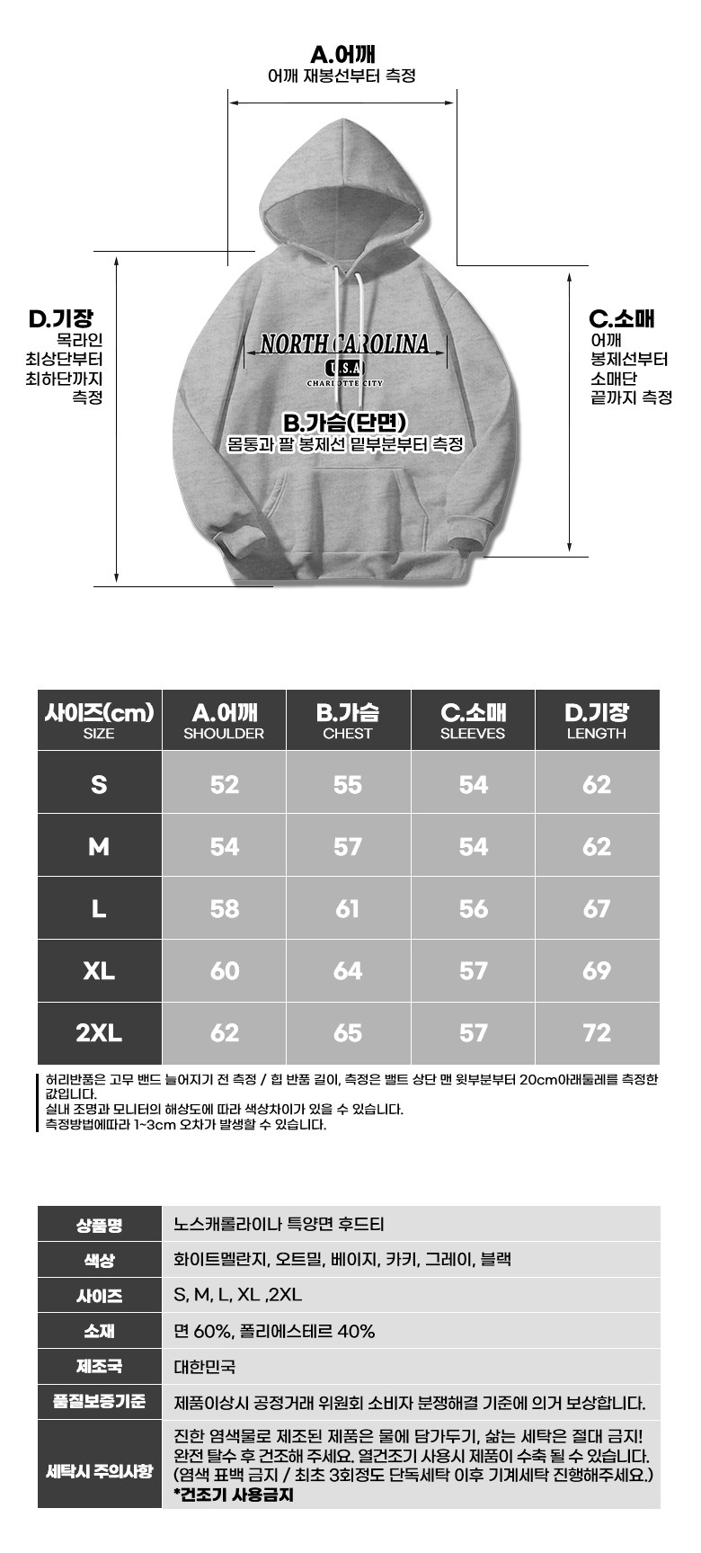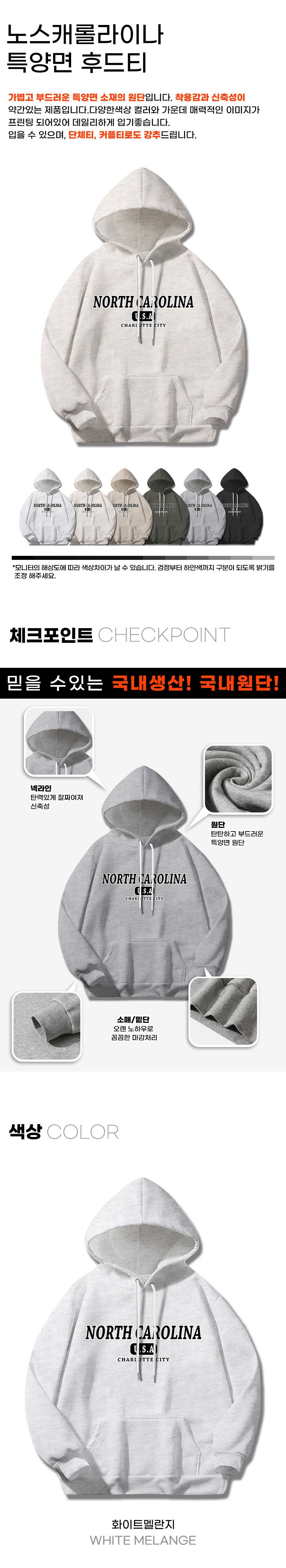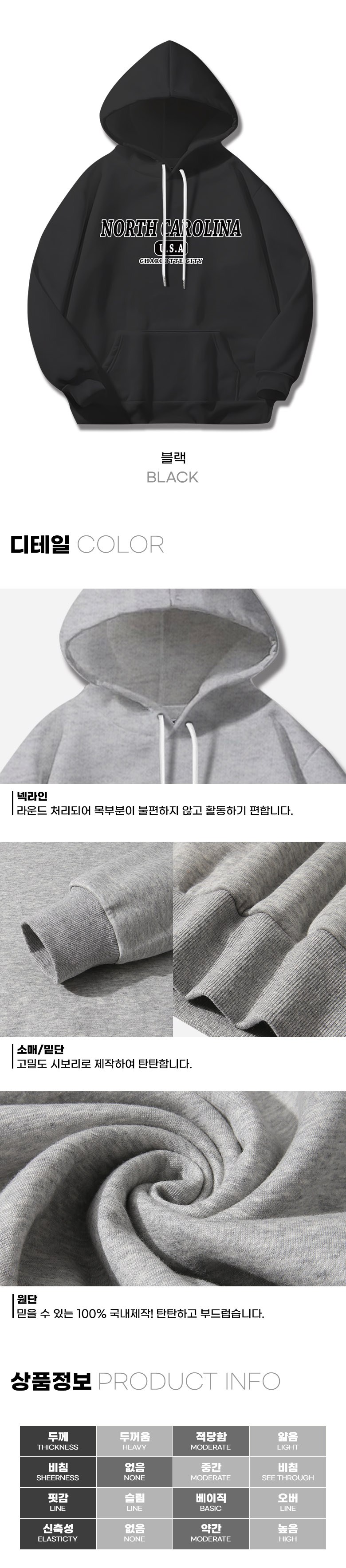 ILLUSO男女通用北卡羅萊納連帽T恤,採用輕盈柔軟的特殊雙面棉布料製成,穿著舒適且略帶彈性。正面印有NORTH CAROLINA U.S.A CHARLOTTE CITY字樣,設計簡約時尚。此款連帽衫有多種顏色可供選擇,適合日常穿搭,也強烈推薦作為情侶裝或團體服。領口採用圓領設計,頸部舒適無束縛感,袖口和下擺則採用高密度羅紋,堅固耐用。韓國製造,品質值得信賴。